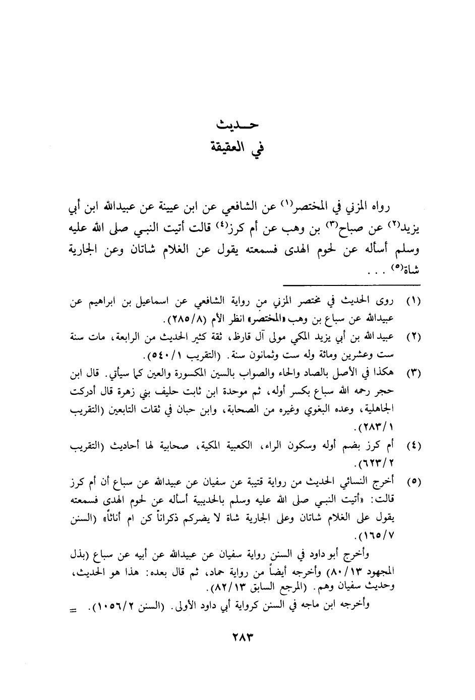 §حَدِيثٌ فِي الْعَقِيقَةِ رَوَاهُ الْمُزَنِيُّ فِي الْمُخْتَصَرِ، عَنِ الشَّافِعِيِّ، عَنِ ابْنِ عُيَيْنَةَ، عَنْ عُبَيْدِ اللَّهِ بْنِ أَبِي يَزِيدَ، عَنْ سِبَاعِ بْنِ ثَابِتٍ، عَنْ أُمِّ كُرْزٍ، قَالَتْ أَتَيْتُ النَّبِيَّ صَلَّى اللهُ عَلَيْهِ وَسَلَّمَ أَسْأَلُهُ عَنْ لُحُومِ الْهَدْيِ فَسَمِعْتُهُ يَقُولُ: «عَنِ الْغُلَامِ شَاتَانِ وَعَنِ الْجَارِيَةِ شَاةٌ»