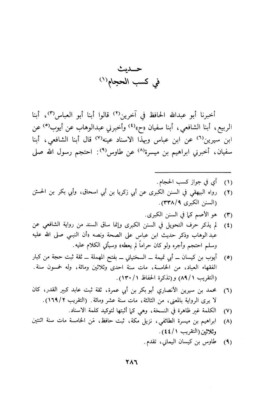 أَخْبَرَنَا أَبُو عَبْدِ اللَّهِ الْحَافِظُ، فِي آخَرِينَ، قَالُوا: أبنا أَبُو الْعَبَّاسِ أبنا الرَّبِيعُ أبنا الشَّافِعِيُّ أبنا سُفْيَانُ، ح وَأَخْبَرَنِي عَبْدُ الْوَهَّابِ عَنْ أَيُّوبَ عَنِ ابْنِ سِيرِينَ عَنِ ابْنِ عَبَّاسٍ، وَبِهَذَا الْإِسْنَادِ عَيْنِهِ قَالَ: أبنا الشَّافِعِيُّ أبنا سُفْيَانُ أَخْبَرَنِي إِبْرَاهِيمُ بْنُ مَيْسَرَةَ عَنْ طَاوُسٍ، §احْتَجَمَ رَسُولُ اللَّهِ صَلَّى اللهُ عَلَيْهِ وَسَلَّمَ -[287]- وَقَالَ لِلْحَجَّامِ: «اشْكِمُوهُ» هَكَذَا وُجِدَ هَذَا الْحَدِيثُ فِي كِتَابِ اخْتِلَافِ الْأَحَادِيثِ، فَنُقِلَ إِلَى الْمُسْنَدِ، وَذَلِكَ يُوهِمُ أَنْ يَكُونَ مَتْنُ حَدِيثِ طَاوُسٍ، وَمَتْنُ حَدِيثِ ابْنِ سِيرِينَ، عَنِ ابْنِ عَبَّاسٍ وَاحِدًا، وَلَيْسَ كَذَلِكَ وَهُوَ مِنَ الْجُمْلَةِ الَّتِي ذَكَرْتُ أَنَّ كِتَابَهُ كَانَ غَائِبًا عَنْهُ، فَرُبَّمَا كَانَ يَكْتُبُ إِسْنَادَ حَدِيثٍ فَيَشُكُّ فِي إِسْنَادِهِ أَوْ مَتْنِهِ فَيَتْرُكُهُ كَذَلِكَ وَيُكْتَبُ مَا لَا شَكَّ فِيهِ، حَتَّى يَرْجِعَ إِلَى كِتَابِهِ فَيُتِمَّهُ عَلَى الصِّحَّةِ، فَلَمْ يُقَدَّرْ ذَلِكَ لِقِصَرِ مُدَّتِهِ وَعَجَلَةِ مَوْتِهِ