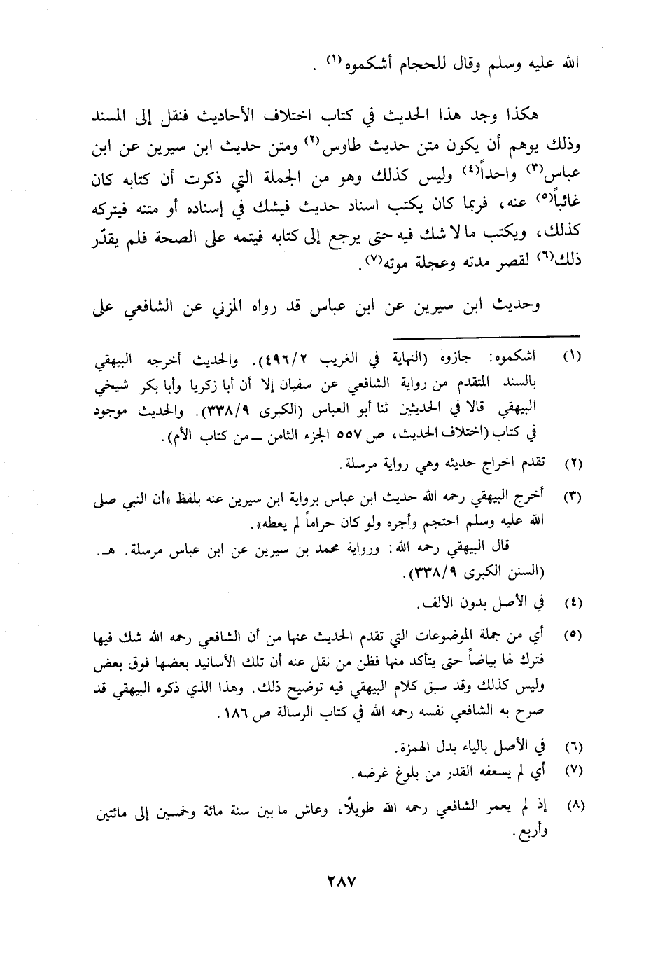 وَحَدِيثِ ابْنِ سِيرِينَ، عَنِ ابْنِ عَبَّاسٍ، قَدْ رَوَاهُ الْمُزَنِيُّ، عَنِ الشَّافِعِيِّ، عَلَى -[288]- الصِّحَّةِ أبناه أَبُو إِسْحَاقَ الْفَقِيهُ أبنا شَافِعُ بْنُ مُحَمَّدِ، ثنا جَعْفَرُ بْنُ سَلَامَةَ ثنا الْمُزَنِيُّ ثنا الشَّافِعِيُّ أبنا عَبْدُ الْوَهَّابِ عَنْ خَالِدٍ الْحَذَّاءِ عَنْ عِكْرِمَةَ، وَمُحَمَّدِ بْنِ سِيرِينَ عَنِ ابْنِ عَبَّاسٍ: أَنَّ النَّبِيَّ صَلَّى اللهُ عَلَيْهِ وَسَلَّمَ §احْتَجَمَ وَأَعْطَى الْحَجَّامَ أَجْرَهُ، وَلَوْ كَانَ خَبِيثًا لَمْ يُعْطِهِ وَمَنْ خَالَفَ هَذِهِ الرِّوَايَةَ عَنْ عَبْدِ الْوَهَّابِ الرِّوَايَةَ الْأُولَى عَنْهُ فِي إِسْنَادِهِ يَدُلُّ عَلَى أَنَّهُ شَكَّ فِيهَا فَتَرَكَهَا، فَكَانَ يَنْبَغِي لِنَاقِلِ هَذَا الْحَدِيثِ مِنَ الْكِتَابِ إِلَى الْمُسْنَدِ أَلَّا يَنْقُلَ الْإِسْنَادَ الْأَوَّلَ وَلَا يَضُمَّهُ إِلَى الْحَدِيثِ الَّذِي رَوَاهُ الشَّافِعِيُّ بَعْدَهُ. وَقَدْ أَخْرَجَ الْبُخَارِيُّ حَدِيثَ عِكْرِمَةَ عَنِ ابْنِ عَبَّاسٍ عَلَى اللَّفْظِ الَّذِي نَقَلَهُ -[289]- الْمُزَنِيُّ عَنْ يَزِيدَ بْنِ زُرَيْعٍ وَعَنْ مُسَدَّدٍ، عَنْ خَالِدٍ الْوَاسِطِيِّ، كِلَاهُمَا عَنْ خَالِدٍ الْحَذَّاءِ، عَنْ عِكْرِمَةَ