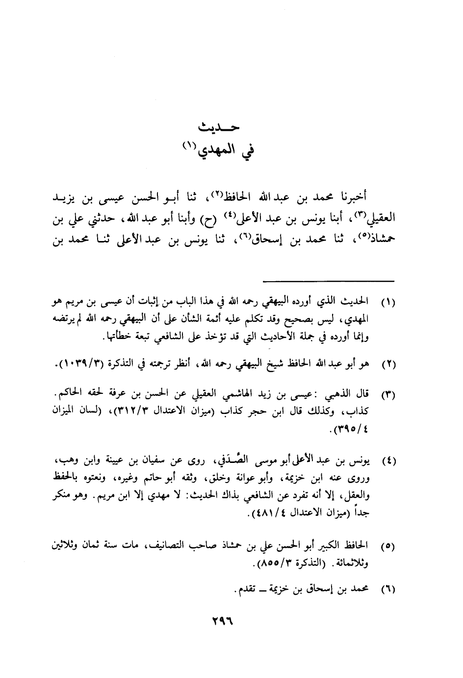 أَخْبَرَنَا مُحَمَّدُ بْنُ عَبْدِ اللَّهِ الْحَافِظُ ثنا أَبُو الْحَسَنِ عِيسَى بْنُ يَزِيدَ الْعُقَيْلِيُّ، أبنا يُونُسُ بْنُ عَبْدِ الْأَعْلَى، ح وأبنا أَبُو عَبْدِ اللَّهِ، حَدَّثَنِي عَلِيُّ بْنُ حَمْشَاذَ، ثنا مُحَمَّدُ بْنُ إِسْحَاقَ ثنا يُونُسُ بْنُ عَبْدِ الْأَعْلَى ثنا مُحَمَّدُ بْنُ -[297]- إِدْرِيسَ الشَّافِعِيُّ أبنا مُحَمَّدُ بْنُ خَالِدٍ الْجَنَدِيُّ عَنْ أَبَانَ بْنِ صَالِحٍ عَنِ الْحَسَنِ عَنْ أَنَسِ بْنِ مَالِكٍ، أَنَّ النَّبِيَّ صَلَّى اللهُ عَلَيْهِ وَسَلَّمَ قَالَ: §" لَا يَزْدَادُ الْأَمْرُ إِلَّا شِدَّةً وَلَا النَّاسُ إِلَّا شُحًّا، وَلَا الدُّنْيَا إِلَّا إِدْبَارًا، وَلَا تَقُومُ السَّاعَةُ إِلَّا عَلَى شِرَارِ النَّاسِ، وَلَا مَهْدِيٌّ إِلَّا -[298]- عِيسَى بْنُ مَرْيَمَ هَذَا الْحَدِيثُ بِهَذَا الْإِسْنَادِ مِمَّا أُنْكِرَ عَلَى الشَّافِعِيِّ، وَقَدْ أبنا أَبُو عَبْدِ اللَّهِ الْحُسَيْنُ بْنُ مُحَمَّدِ بْنِ الْحُسَيْنِ بْنِ فِنْجَوَيْهِ الدِّينَوَرِيُّ، ثنا طِغْرَانُ بْنُ الْحُسَيْنِ، حَدَّثَنِي مُحَمَّدُ بْنُ عَلِيِّ بْنِ إِسْحَاقَ الْمَرْوَزِيُّ بِقِرْمِيسِينَ، ثنا عُبَيْدُ اللَّهِ بْنُ مُحَمَّدِ بْنِ عِيسَى الْمَرْوَزِيُّ، سَمِعْتُ أَحْمَدَ بْنَ -[299]- سِنَانٍ يَقُولُ، كُنْتُ عِنْدَ يَحْيَى بْنِ مَعِينٍ جَالِسًا فِي مَسْجِدِهِ فَدَخَلَ عَلَيْهِ صَالِحٌ جَزْرَةُ، وَأَقْبَلَ عَلَيْهِ يُذَاكِرُهُ حَتَّى ذَكَرَ الْحَسَنَ عَنْ أَنَسٍ أَنَّ النَّبِيَّ صَلَّى اللهُ عَلَيْهِ وَسَلَّمَ قَالَ: «لَا مَهْدِيَّ إِلَّا عِيسَى» قَالَ: بَلَغَنِي عَنِ الشَّافِعِيِّ أَنَّهُ رَوَاهُ، وَالشَّافِعِيُّ عِنْدَنَا ثِقَةٌ قَالَ الشَّيْخُ: وَهَذَا الْحَدِيثُ إِنْ كَانَ مُنْكَرًا بِهَذَا الْإِسْنَادِ كَانَ الْحَمْلُ فِيهِ عَلَى مُحَمَّدِ بْنِ خَالِدٍ الْجَنَدِيِّ، فَإِنَّهُ شَيْخٌ مَجْهُولٌ لَمْ يُعْرَفْ بِمَا تَثْبُتُ بِهِ عَدَالَتُهُ، وَيُوجِبُ قَبُولَ خَبَرِهِ وَقَدْ رَوَاهُ غَيْرُ الشَّافِعِيِّ عَنْهُ، كَمَا رَوَاهُ الشَّافِعِيُّ، وَهُوَ فِيمَا أبنا أَبُو عَبْدِ اللَّهِ الْحَافِظُ، حَدَّثَنِي أَبُو أَحْمَدَ عَبْدُ الرَّحْمَنِ بْنُ عَبْدِ اللَّهِ بْنِ يَزْدَادَ الرَّازِيُّ الْمُزَكِّي بِبُخَارَا مِنْ كِتَابِهِ، ثنا أَبُو مُحَمَّدٍ عَبْدُ الرَّحْمَنِ بْنُ أَحْمَدَ بْنِ مُحَمَّدِ بْنِ -[300]- الْحَجَّاجِ بْنِ رِشْدِينَ بْنِ سَعْدٍ الْمَهْرِيُّ بِمِصْرَ، حَدَّثَنِي أَبُو سَعِيدٍ الْمُفَضَّلُ بْنُ مُحَمَّدٍ الْجَنَدِيُّ، ثنا صَامِتُ بْنُ مُعَاذٍ، ثنا يَحْيَى بْنُ السَّكَنِ، ثنا مُحَمَّدُ بْنُ خَالِدٍ الْجَنَدِيُّ، فَذَكَرَهُ بِإِسْنَادِهِ نَحْوَهُ وَبِإِسْنَادِهِ قَالَ، قَالَ صَامِتُ بْنُ مُعَاذٍ: عَدَلْتُ إِلَى الْجَنَدِ مَسِيرَةَ يَوْمَيْنِ مِنْ صَنْعَا، فَدَخَلْتُ عَلَى مُحَدِّثٍ لَهُمْ، فَطَلَبْتُ هَذَا الْحَدِيثَ فَوَجَدْتُهُ عِنْدَهُ عَنْ مُحَمَّدِ بْنِ خَالِدٍ الْجَنَدِيِّ، عَنْ أَبَانَ بْنِ أَبِي عَيَّاشٍ، عَنِ الْحَسَنِ، عَنِ النَّبِيِّ صَلَّى اللهُ عَلَيْهِ وَسَلَّمَ مِثْلَهُ، فَإِنْ كَانَتِ الرِّوَايَةُ عَنْ مُحَمَّدِ بْنِ خَالِدٍ صَحِيحَةً، وَقَدْ رَوَاهُ مَرَّةً أُخْرَى بِخِلَافِهَا كَانَ هَذَا تَخْلِيطًا مِنْ جِهَتِهِ بِرِوَايَتِهِ مَرَّةً هَكَذَا، وَمَرَّةً هَكَذَا، إِلَّا أَنَّ فِيَ صِحَّتِهَا عَنْهُ نَظَرٌ فَإِنَّهُ عَنْ مُحَدِّثٍ مَجْهُولٍ -[301]-. وَقَدْ رُوِي هَذَا الْحَدِيثُ دُونَ قَوْلِهِ: وَلَا مَهْدِيَّ إِلَّا عِيسَى بْنُ مَرْيَمَ، مِنْ أَوْجُهٍ: مِنْهَا مَا أبنا أَبُو جَعْفَرٍ كَامِلُ بْنُ أَحْمَدَ الْمُسْتَمْلِي، أَخْبَرَنِي أَبُو أَحْمَدَ الْحُسَيْنُ بْنُ عَلِيٍّ التَّمِيمِيُّ، مِنْ كِتَابِهِ، ثنا عَبْدُ اللَّهِ بْنُ مُحَمَّدِ بْ