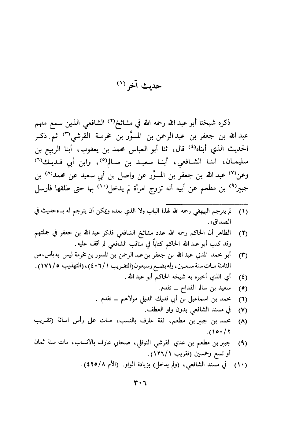 §حَدِيثٌ آخَرُ ذَكَرَهُ شَيْخُنَا أَبُو عَبْدِ اللَّهِ رَحِمَهُ اللَّهُ فِي مَشَائِخِ الشَّافِعِيِّ الَّذِينَ سَمِعَ مِنْهُمَ عَبْدُ اللَّهِ بْنُ جَعْفَرِ بْنِ عَبْدِ الرَّحْمَنِ بْنِ الْمِسْوَرِ بْنِ مَخْرَمَةَ الْقُرَشِيُّ، ثُمَّ ذَكَرَ الْحَدِيثَ الَّذِي أبناه قَالَ: ثنا أَبُو الْعَبَّاسِ مُحَمَّدُ بْنُ يَعْقُوبَ، أبنا الرَّبِيعُ بْنُ سُلَيْمَانَ، أبنا الشَّافِعِيُّ، أبنا سَعِيدُ بْنُ سَالِمٍ وَابْنُ أَبِي فُدَيْكٍ، وَعَنْ عَبْدِ اللَّهِ بْنِ جَعْفَرِ بْنِ الْمِسْوَرِ، عَنْ وَاصِلِ بْنِ أَبِي سَعِيدٍ، عَنْ مُحَمَّدِ بْنِ جُبَيْرِ بْنِ مُطْعِمٍ، عَنْ أَبِيهِ أَنَّهُ تَزَوَّجَ امْرَأَةً لَمْ يَدْخُلْ بِهَا حَتَّى طَلَّقَهَا، فَأَرْسَلَ