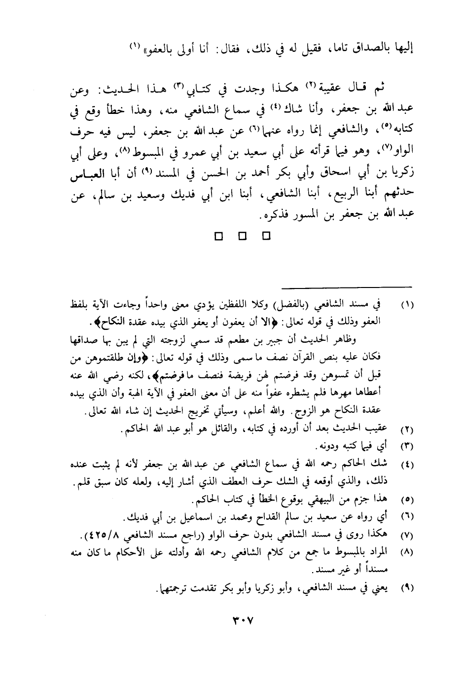 إِلَيْهَا بِالصَّدَاقِ تَامًّا، فَقِيلَ لَهُ فِي ذَلِكَ، فَقَالَ: أَنَا أَوْلَى بِالْعَفْوِ. ثُمَّ قَالَ عُقَيْبَهُ: هَكَذَا وَجَدْتُ فِي كِتَابِي هَذَا الْحَدِيثَ: وَعَنْ عَبْدِ اللَّهِ بْنِ جَعْفَرٍ، وَأَنَا شَاكٌّ فِي سَمَاعِ الشَّافِعِيِّ مِنْهُ، وَهَذَا خَطَأٌ وَقَعَ فِي كِتَابِهِ، وَالشَّافِعِيُّ إِنَّمَا رَوَاهُ عَنْهُمَا عَنْ عَبْدِ اللَّهِ بْنِ جَعْفَرٍ لَيْسَ فِيهِ حَرْفُ الْوَاوِ، وَهُوَ فِيمَا قَرَأْتُهُ عَلَى أَبِي سَعِيدِ بْنِ أَبِي عَمْرٍو فِي الْمَبْسُوطِ، وَعَلَى أَبِي زَكَرِيَّا بْنِ أَبِي إِسْحَاقَ وَأَبِي بَكْرٍ أَحْمَدَ بْنِ الْحَسَنِ فِي الْمُسْنَدِ: أَنَّ أَبَا الْعَبَّاسِ حَدَّثَهُمُ، أبنا الرَّبِيعُ، أبنا الشَّافِعِيُّ، أبنا ابْنُ أَبِي فُدَيْكٍ وَسَعِيدُ بْنُ سَالِمٍ، عَنْ عَبْدِ اللَّهِ بْنِ جَعْفَرِ بْنِ الْمِسْوَرِ فَذَكَرَهُ