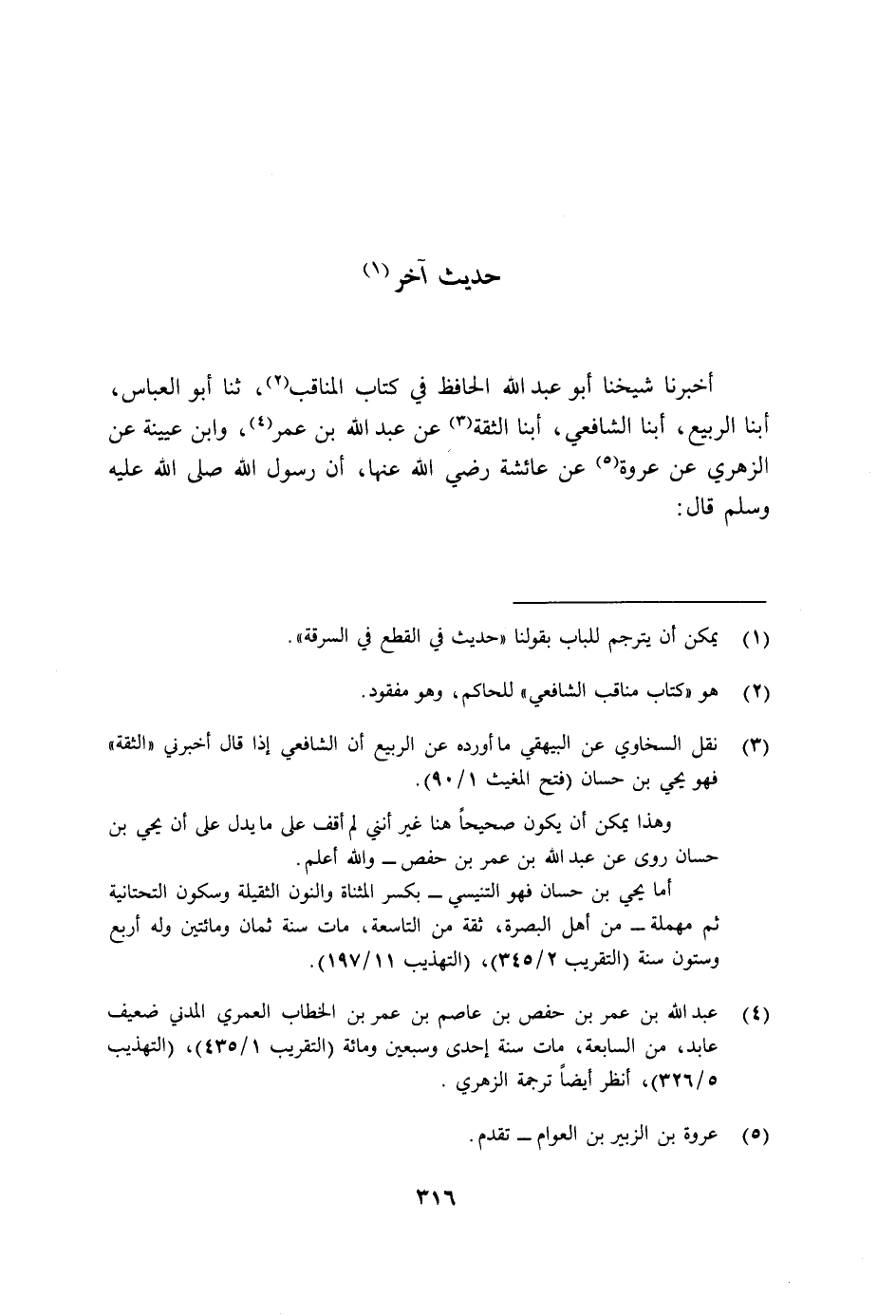 أَخْبَرَنَا شَيْخِنَا أَبُو عَبْدِ اللَّهِ الْحَافِظُ، فِي كِتَابِ الْمَنَاقِبِ، ثنا أَبُو الْعَبَّاسِ أبنا الرَّبِيعُ أبنا الشَّافِعِيُّ أبنا الثِّقَةُ عَنْ عَبْدِ اللَّهِ بْنِ عُمَرَ، وَابْنِ عُيَيْنَةَ، عَنِ الزُّهْرِيِّ عَنْ عُرْوَةَ عَنْ عَائِشَةَ، رَضِيَ اللَّهُ عَنْهَا: أَنَّ رَسُولَ اللَّهِ صَلَّى اللهُ عَلَيْهِ وَسَلَّمَ قَالَ -[317]-: «§الْقَطْعُ فِي رُبْعِ دِينَارٍ فَصَاعِدًا» قَالَ: وَبِهَذَا نَأْخُذُ، هَذَا حَدِيثٌ أَوْرَدَهُ الشَّافِعِيُّ رَحِمَهُ اللَّهُ فِي كِتَابِ -[318]- اخْتِلَافِ الْعِرَاقِيِّينَ، وَهُوَ عَنِ ابْنِ عُيَيْنَةَ لَهُ مَسْمُوعٌ قَدْ رَوَاهُ عَنْهُ فِي كِتَابِ الْقَطْعِ فِي السَّرِقَةِ وَغَيْرِهِ، وَإِنَّمَا رَوَاهُ عَنِ الثِّقَةِ عِنْدَهُ عَنِ الْعُمَرِيِّ غَيْرَ أَنَّهُ قَالَ فِي إِسْنَادِهِ: عَنِ الزُّهْرِيِّ عَنْ عَمْرَةَ عَنْ عَائِشَةَ فَأَخْطَأَ شَيْخُنَا رَحِمَهُ اللَّهُ فِي النَّقْلِ، فَقَالَ: عَنْ عُرْوَةَ، عَنْ عَائِشَةَ، وَكِتَابُ اخْتِلَافِ الْعِرَاقِيِّينَ الَّذِي فِي أَيْدِي النَّاسِ يَشْهَدُ لِمَا قُلْتُ بِالصِّحَّةِ. وَقَدْ رَوَاهُ يُونُسُ بْنُ يَزِيدَ الْأَيْلِيُّ، عَنِ الزُّهْرِيِّ، عَنْ عُرْوَةَ وَعُمْرَةَ، عَنْ عَائِشَةَ رَضِيَ اللَّهُ عَنْهُمَا، وَرُوِيَ عَنْ هَمَّامٍ، عَنْ قَتَادَةَ، عَنِ الزُّهْرِيِّ، عَنْ عُرْوَةَ عَنْ عَائِشَةَ رَضِيَ اللَّهُ عَنْهَا، لَكِنْ مِنْ جِهَةِ سُفْيَانَ بْنِ عُيَيْنَةَ، عَنِ الزُّهْرِيِّ، وَإِنَّمَا هُوَ عَنْ عَمْرَةَ عَنْ عَائِشَةَ رَضِيَ اللَّهُ عَنْهَا، وَاللَّهُ أَعْلَمُ بِالصَّوَابِ