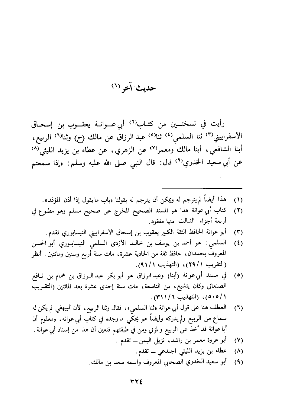 §حَدِيثٌ آخَرُ رَأَيْتُ فِيَ نُسْخَتَيْنِ مِنْ كِتَابِ أَبِي عَوَانَةَ: يَعْقُوبُ بْنُ إِسْحَاقَ الْإِسْفَرَايِينِيُّ، ثنا السُّلَمِيُّ، ثنا عَبْدُ الرَّزَّاقِ، عَنْ مَالِكٍ ح وَثنا الرَّبِيعُ، أبنا الشَّافِعِيُّ، أبنا مَالِكٌ وَمَعْمَرٌ، عَنِ الزُّهْرِيِّ، عَنْ عَطَاءِ بْنِ يَزِيدَ اللَّيْثِيِّ، عَنْ أَبِي سَعِيدٍ الْخُدْرِيِّ، قَالَ: قَالَ النَّبِيُّ صَلَّى اللهُ عَلَيْهِ وَسَلَّمَ: «إِذَا سَمِعْتُمُ