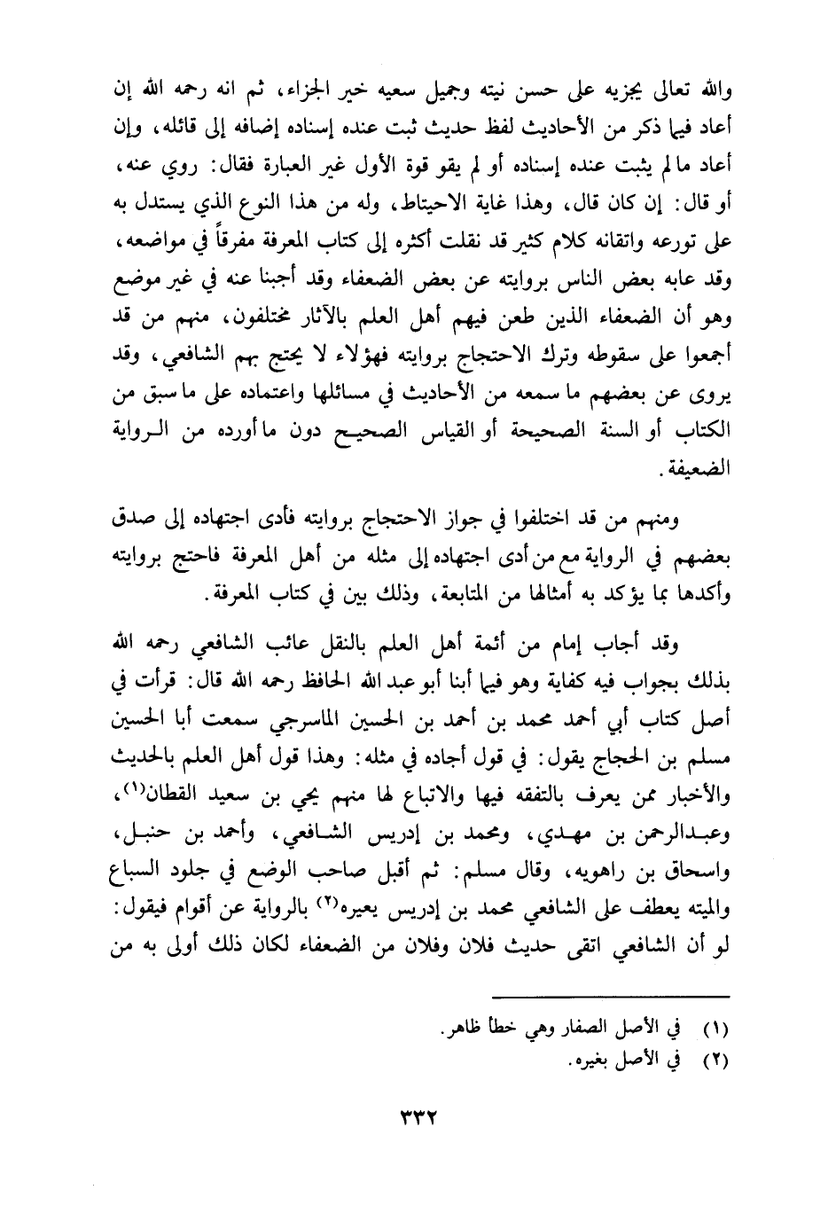 ، وَاللَّهُ تَعَالَى يَجْزِيهِ عَلَى حُسْنِ نِيَّتِهِ وَجَمِيلِ سَعْيِهِ خَيْرَ الْجَزَاءِ، ثُمَّ إِنَّهُ رَحِمَهُ اللَّهُ إِنْ أَعَادَ فِيمَا ذُكِرَ مِنَ الْأَحَادِيثِ لَفْظَ حَدِيثٍ ثَبَتَ عِنْدَهُ إِسْنَادُهُ إِضَافَةً إِلَى قَائِلِهِ، وَإِنْ أَعَادَ مَا لَمْ يَثْبُتْ عِنْدَهُ إِسْنَادُهُ أَوْ لَمْ يَقْوَ قُوَّةَ الْأَوَّلِ غَيْرَ الْعِبَارَةِ، فَقَالَ: رُوِيَ عَنْهُ، أَوْ قَالَ: إِنْ كَانَ قَالَ، وَهَذَا غَايَةُ الِاحْتِيَاطِ، وَلَهُ مِنْ هَذَا النَّوْعِ الَّذِي يُسْتَدَلُّ بِهِ عَلَى تَوَرُّعِهِ وَإِتْقَانِهِ كَلَامٌ كَثِيرٌ قَدْ نَقَلْتُ أَكْثَرَهُ إِلَى كِتَابِ الْمَعْرِفَةِ مُفَرَّقًا فِي مَوَاضِعِهِ، وَقَدْ عَابَهُ بَعْضُ النَّاسِ بِرِوَايَتِهِ عَنْ بَعْضِ الضُّعَفَاءِ وَقَدْ أَجَبْنَا عَنْهُ فِي غَيْرِ مَوْضِعٍ وَهُوَ أَنَّ الضُّعَفَاءَ الَّذِينِ طَعَنَ فِيهِمْ أَهْلُ الْعِلْمِ بِالْآثَارِ مُخْتَلِفُونَ، مِنْهُمْ مَنْ قَدْ أَجْمَعُوا عَلَى سُقُوطِهِ وَتَرْكِ الِاحْتِجَاجِ بِرَِوايَتِهِ فَهَؤُلَاءِ لَا يَحْتَجُّ بِهِمُ الشَّافِعِيُّ، وَقَدْ يَرْوِي عَنْ بَعْضِ مَا سَمِعَهُ مِنَ الْأَحَادِيثِ فِي مَسَائِلِهَا، وَاعْتِمَادُهُ عَلَى مَا سَبَقَ مِنَ الْكِتَابِ أَوِ السُّنَّةِ الصَّحِيحَةِ أَوِ الْقِيَاسِ الصَّحِيحِ دُونَ مَا أَوْرَدَهُ مِنَ الرِّوَايَةِ الضَّعِيفَةِ، وَمِنْهُمْ مَنْ قَدِ اخْتَلَفُوا فِي جَوَازِ الِاحْتِجَاجِ بِرَوَايَتِهِ فَأَدَّى اجْتِهَادُهُ إِلَى صِدْقِ بَعْضِهِمْ فِي الرِّوَايَةِ مَعَ مَنْ أَدَّى اجِتِهَادُهُ إِلَى مِثْلِهِ مِنْ أَهْلِ الْمَعْرِفَةِ فَاحْتَجَّ بِرِوَايَتِهَ وَأَكَدَّهَا بِمَا يُؤَكَّدُ بِهِ أَمْثَالُهَا مِنَ الْمُتَابَعَةِ، وَذَلِكَ بَيِّنٌ فِي كِتَابِ الْمَعْرِفَةِ، وَقَدْ أَجَابَ إِمَامٌ مِنْ أَئِمَّةِ أَهْلِ الْعِلْمِ بِالنَّقْلِ عَائِبَ الشَّافِعِيِّ رَحِمَهُ اللَّهُ بِذَلِكَ بِجَوَابٍ فِيهِ كِفَايَةٌ وَهُوَ فِيمَا أبنا أَبُو عَبْدِ اللَّهِ الْحَافِظُ رَحِمَهُ اللَّهُ قَالَ: قَرَأْتُ فِي أَصْلِ كِتَابِ أَبِي أَحْمَدَ مُحَمَّدِ بْنِ أَحْمَدَ بْنِ الْحُسَيْنِ الْمَاسَرْجِيِّ سَمِعْتُ أَبَا الْحُسَيْنِ مُسْلِمَ بْنَ الْحَجَّاجِ يَقُولُ: فِي قَوْلٍ أَجَادَهُ فِي مِثْلِهِ: وَهَذَا قَوْلُ أَهْلِ الْعِلْمِ بِالْحَدِيثِ وَالْأَخْبَارِ مِمَّنْ يُعْرَفُ بِالتَّفَقُّهِ فِيهَا وَالِاتِّبَاعِ لَهَا مِنْهُمْ يَحْيَى بْنُ سَعِيدٍ الْقَطَّانُ، وَعَبْدُ الرَّحْمَنِ بْنُ مَهْدِيٍّ، وَمُحَمَّدُ بْنُ إِدْرِيسَ الشَّافِعِيُّ، وَأَحْمَدُ بْنُ حَنْبَلٍ، وَإِسْحَاقُ بْنُ رَاهَوْيِهِ، وَقَالَ مُسْلِمٌ: ثُمَّ أَقْبَلَ صَاحِبٌ الْوَضْعِ فِي جُلُودِ السِّبَاعِ وَالْمَيْتَةِ يَعْطِفُ عَلَى الشَّافِعِيِّ مُحَمَّدِ بْنِ إِدْرِيسَ يُعَيِّرُهُ بِالرِّوَايَةِ عَنْ أَقْوَامٍ فَيَقُولُ: لَوْ أَنَّ الشَّافِعِيَّ اتَّقَى حَدِيثَ فُلَانٍ وَفُلَانٍ مِنَ الضُّعَفَاءِ لَكَانَ ذَلِكَ أَوْلَى بِهِ مِنْ