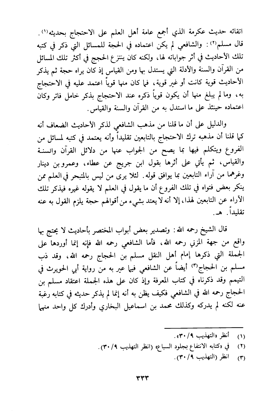 اتِّقَائِهِ حَدِيثَ عِكْرِمَةَ الَّذِي أَجْمَعَ عَامَةُ أَهْلِ الْعِلْمِ عَلَى الِاحْتِجَاجِ بِحَدِيثِهِ، قَالَ مُسْلِمٌ: والشَّافِعِيُّ لَمْ يَكُنِ اعْتِمَادُهُ فِي الْحُجَّةِ لِلْمَسَائِلِ الَّتِي ذَكَرَ فِي كُتُبِهِ تِلْكَ الْأَحَادِيثَ فِي أَثَرِ جَوَابَاتِهِ لَهَا، وَلَكِنَّهُ كَانَ يَنْتَزِعُ الْحُجَجَ فِي أَكْثِرِ تِلْكَ الْمَسَائِلِ مِنَ الْقُرْآنِ وَالسُّنَّةِ وَالْأَدِلَّةِ الَّتِي يُسْتَدَلُّ بِهَا وَمِنَ الْقِيَاسِ إِذْ كَانَ يَرَاهُ حُجَّةً ثُمَّ يَذْكُرُ الْأَحَادِيثَ قَوِيَّةً كَانَتْ أَوْ غَيْرَ قَوِيَّةٍ، فَمَا كَانَ مِنْهَا قَوِيًّا اعْتَمَدَ عَلَيهِ فِي الِاحْتِجَاجِ بِهِ، وَمَا لَمْ يَبْلُغْ مِنْهَا أَنْ يَكُونَ قَوِيًّا ذَكَرَهُ عِنْدَ الِاحْتِجَاجِ بِذِكْرٍ خَامِلٍ فَاتِرٍ وَكَانَ اعْتِمَادُهُ حِينَئِذٍ عَلَى مَا اسْتَدَلَّ بِهِ مِنَ الْقُرْآنِ وَالسّنَّةِ وَالْقِيَاسِ، وَالدَّلِيلُ عَلَى أَنَّ مَا قُلْنِاَ مِنْ مَذْهَبِ الشَّافِعِيِّ لِذِكْرِ الْأَحَادِيثِ الضِّعَافِ أَنَّهُ - كَمَا قُلْنَا - أَنَّ مَذْهَبَهُ تَرْكُ الِاحْتِجَاجِ بِالتَّابِعِينَ تَقْلِيدًا، وَأَنَّهُ يَعْتَمِدُ فِي كُتُبِهِ لِمِسَائِلَ مِنَ الْفُرُوعِ وَيَتَكَلَّمُ فِيهَا بِمَا يَصِحُّ مِنَ الْجَوَابِ عَنْهَا مَنْ دَلَائِلِ الْقُرْآنِ وَالسُّنَّةِ وَالْقِيَاسِ، ثُمَّ يَأْتِي عَلَى أَثَرِهَا بِقَولِ ابْنِ جُرَيْجٍ عَنْ عَطَاءٍ، وَعَمْرِو بْنِ دِينَارٍ وَغَيْرِهِمَا مِنْ آرَاءِ التَّابِعِينَ بِمَا يُوَافِقُ قَوْلَهُ؛ لِئَلَّا يَرَى مَنْ لَيْسَ بِالْمتَبَحِّرِ فِي الْعِلْمِ مِمَّنْ يُنْكِرُ بَعْضَ فَتْوَاهُ فِي تِلْكَ الْفُرُوعِ أَنَّ مَا يَقُولُ فِي الْعِلْمِ لَا يَقُولُهُ غَيْرُهُ فَيَذْكُرُ تِلْكَ الْآرَاءِ عَنِ التَّابِعِينَ لِهَذَا، إِلَّا أَنَّهُ لَا يَعْتَدُّ بِشَيْءِ مِنْ أَقْوَالِهِمْ حُجَّةً يَلْزَمُ الْقَوْلُ بِهِ عَنْهُ تَقْلِيدًا، قَالَ الشَّيْخُ رَحِمَهُ اللَّهُ: وَتَصْدِيرُ بَعْضِ أَبْوَابِ الْمُخْتَصَرِ بِأَحَادِيثَ لَا يُحْتَجُّ بِهَا وَاقِعٌ مِنْ جِهَةِ الْمُزَنِيِّ رَحِمَهُ اللَّهُ، فَأَمَّا الشَّافِعِيُّ رَحِمَهُ اللَّهُ فِإِنَّهُ إِنَّمَا أَوْرَدَهَا عَلَى الْجُمْلَةِ الَّتِي ذَكَرَهَا إِمَامُ أَهْلِ النَّقْلِ مسْلِمُ بْنُ الْحَجَّاجِ رَحِمَهُ اللَّهُ، وَقَدْ ذَبَّ مُسْلِمُ بْنُ الْحَجَّاجِ أَيْضًا عَنِ الشَّافِعِيِّ فِيمَا عُيِّرَ بِهِ مِنْ رِوَايَةِ أَبِي الْحُوَيْرِثِ فِي التَّيَمُّمِ، وَقَدْ ذَكَرْنَاهُ فِي كِتَابِ الْمَعْرِفَةِ وَإِذْ كَانَ عَلَى هَذِهِ الْجُمْلَةِ اعْتِقَادُ مُسْلِمِ بْنِ الْحَجَّاجِ رَحِمَهُ اللَّهُ فِي الشَّافِعِيِّ فَكَيْفُ يُظَنُّ بِهِ أَنَّهُ إِنَّمَا لَمْ يَذْكُرْ حَدِيثَهُ فِي كِتَابِهِ رَغْبَةً عَنْهُ لَكِنَّهُ لَمْ يُدْرِكْهُ، وَكَذَلِكَ محَمَّدُ بْنُ إِسْمَاعِيلَ الْبُخَارِيُّ وَأَدْرَكَ كُلٌّ وَاحِدٍ مِنْهُمَا