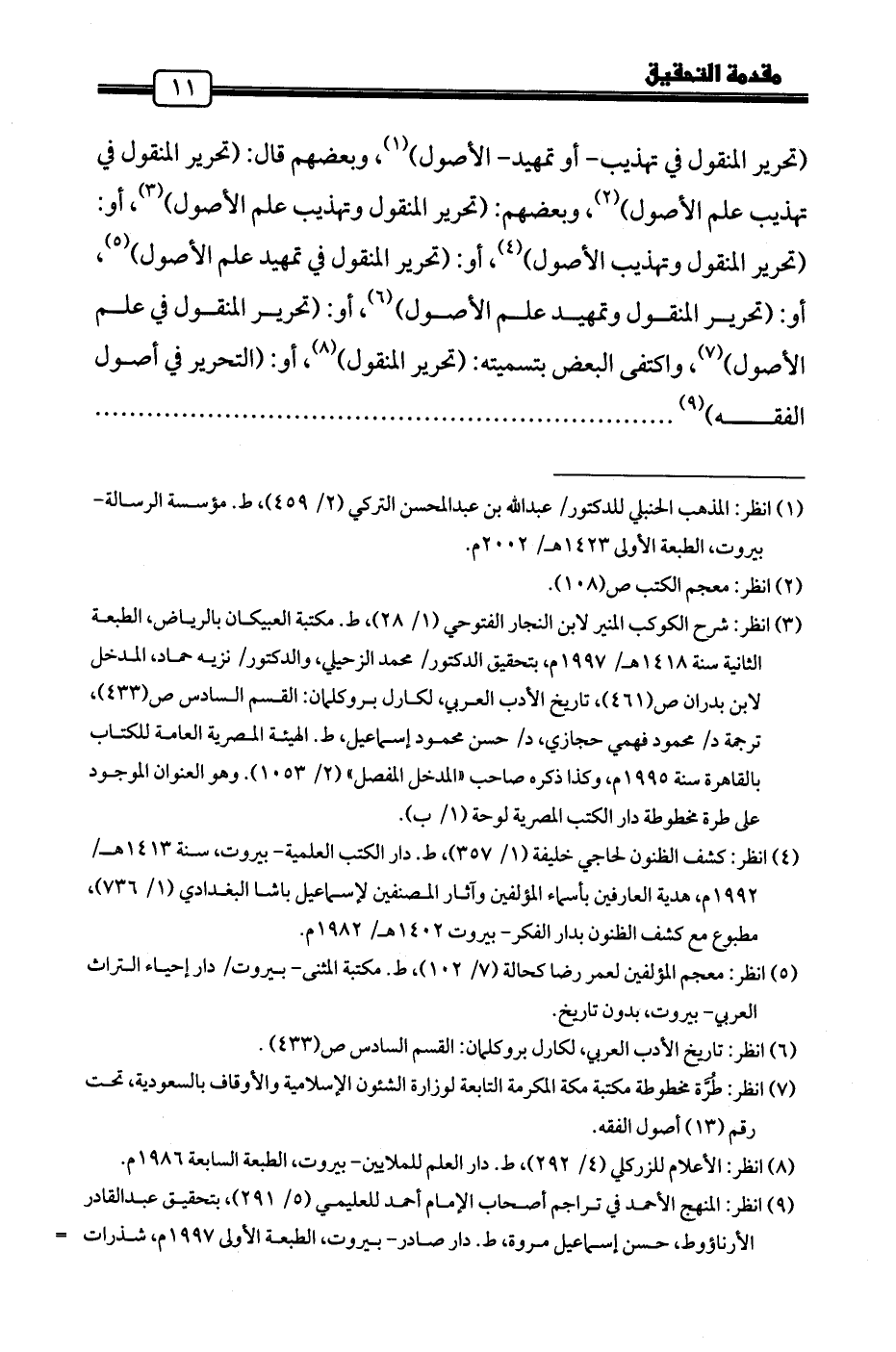(¬3) انظر: شرح الكوكب المنير لابن النجار الفتوحي (1/ 28)، ط. مكتبة العبيكان بالرياض، الطبعة الثانية سنة 1418 هـ/ 1997 م، بتحقيق الدكتور/ محمد الزحيلي، والدكتور/ نزيه حماد، المدخل لابن بدران ص (461)، تاريخ الأدب العربي، لكارل بروكلمان: القسم السادس ص (433)، ترجمة د/ محمود فهمي حجازي، د/ حسن محمود إسماعيل، ط. الهيئة المصرية العامة للكتاب بالقاهرة سنة 1995 م، وكذا ذكره صاحب "المدخل المفصل" (2/ 1053). وهو العنوان الموجود على طرة مخطوطة دار الكتب المصرية لوحة (1/ ب).