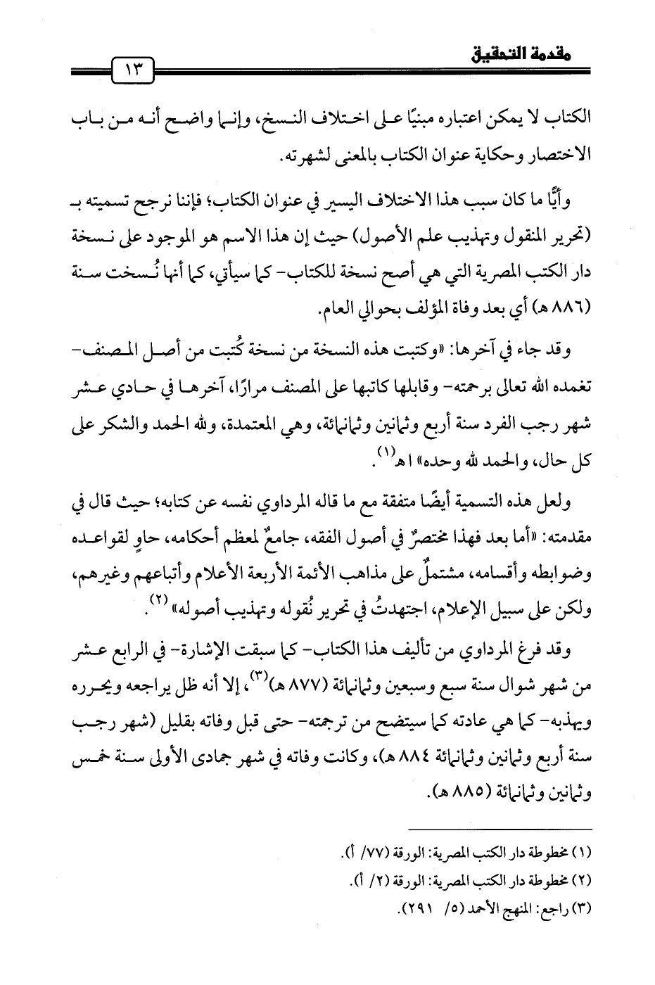 وقد فرغ المرداوي من تأليف هذا الكتاب -كما سبقت الإشارة - في الرابع عشر من شهر شوال سنة سبع وسبعين وثمانمائة (877 هـ) (¬3)، إلا أنه ظل يراجعه ويحرره ويهذبه -كما هي عادته كما سيتضح من ترجمته- حتى قبل وفاته بقليل (شهر رجب سنة أربع وثمانين وثمانمائة 884 هـ)، وكانت وفاته في شهر جمادى الأولى سنة خمس وثمانين وثمانمائة (885 هـ).