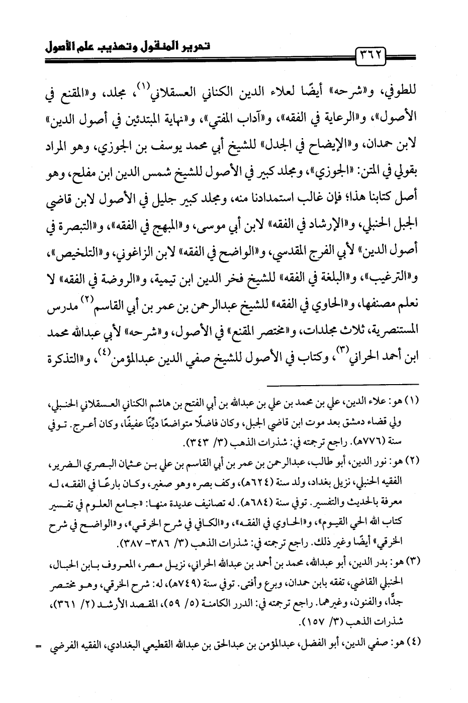 للطوفي، و"شرحه" أيضًا لعلاء الدين الكناني العسقلاني (¬1)، مجلد، و"المقنع في الأصول"، و"الرعاية في الفقه"، و"آداب المفتي"، و"نهاية المبتدئين في أصول الدين" لابن حمدان، و"الإيضاح في الجدل" للشيخ أبي محمد يوسف بن الجوزي، وهو المراد بقولي في المتن: "الجوزي"، ومجلد كبير في الأصول للشيخ شمس الدين ابن مفلح، وهو أصل كتابنا هذا، فإن غالب استمدادنا منه، ومجلد كبير جليل في الأصول لابن قاضي الجبل الحنبلي، و"الإرشاد في الفقه" لابن أبي موسى، و"المبهج في الفقه"، و"التبصرة في أصول الدين" لأبي الفرج المقدسي، و"الواضح في الفقه" لابن الزاغوني، و"التلخيص"، و"الترغيب"، و"البلغة في الفقه" للشيخ فخر الدين ابن تيمية، و"الروضة في الفقه" لا نعلم مصنفها، و"الحاوي في الفقه" للشيخ عبد الرحمن بن عمر بن أبي القاسم (¬2) مدرس المستنصرية، ثلاث مجلدات، و"مختصر المقنع" في الأصول، و"شرحه" لأبي عبد اللَّه محمد ابن أحمد الحراني (¬3)، وكتاب في الأصول للشيخ صفي الدين عبد المؤمن (¬4)، و"التذكرة