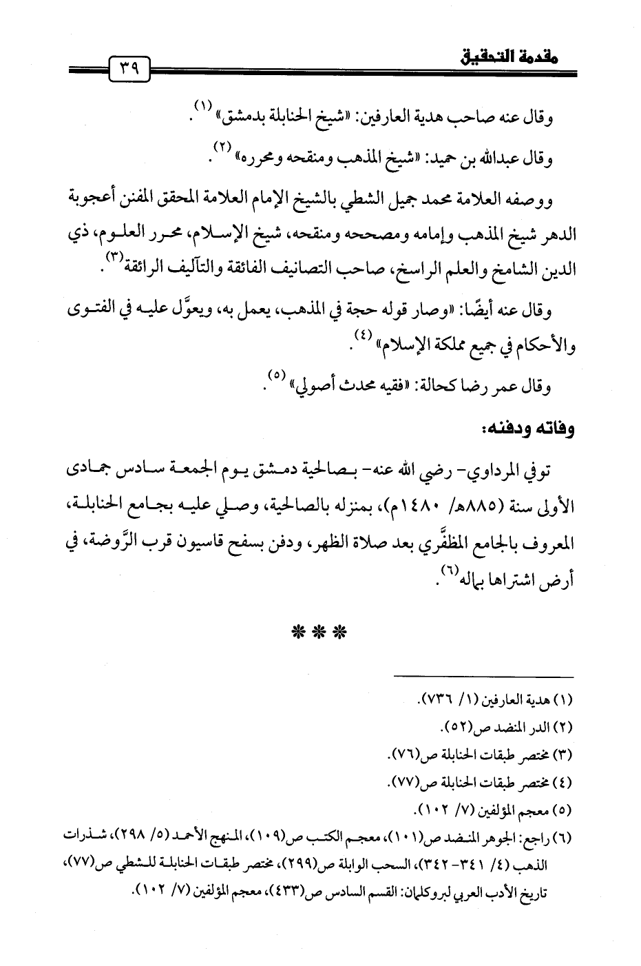 (¬6) راجع: الجوهر المنضد ص (101)، معجم الكتب ص (109)، المنهج الأحمد (5/ 298)، شذرات الذهب (4/ 341 - 342)، السحب الوابلة ص (299)، مختصر طبقات الحنابلة للشطي ص (77)، تاريخ الأدب العربي لبروكلمان: القسم السادس ص (433)، معجم المؤلفين (7/ 102).