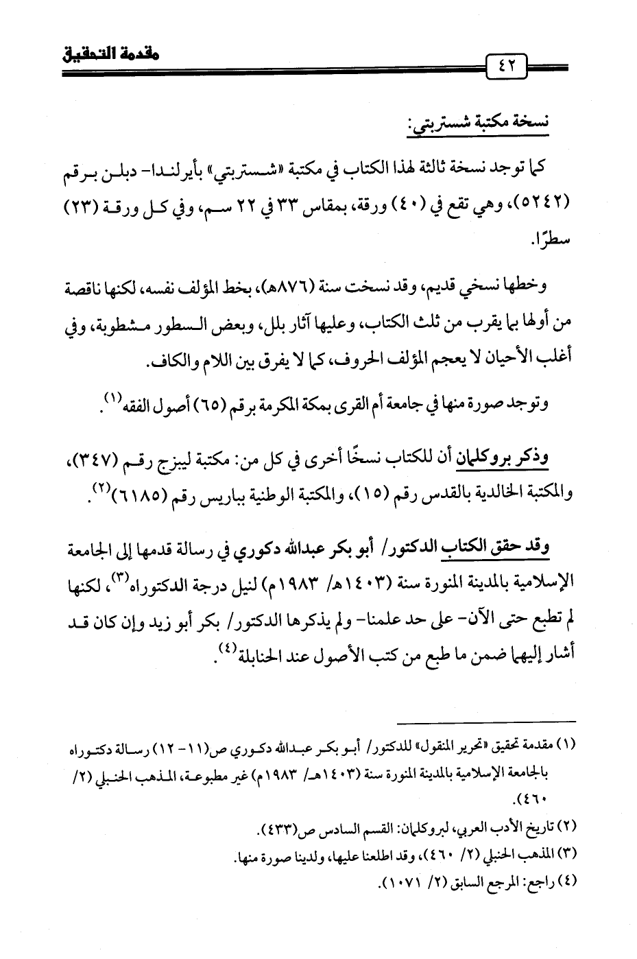 (¬1) مقدمة تحقيق "تحرير المنقول" للدكتور/ أبو بكر عبد اللَّه دكوري ص (11 - 12) رسالة دكتوراه بالجامعة الإسلامية بالمدينة المنورة سنة (1403 هـ / 1983 م) غير مطبوعة، المذهب الحنبلي (2/ 460).