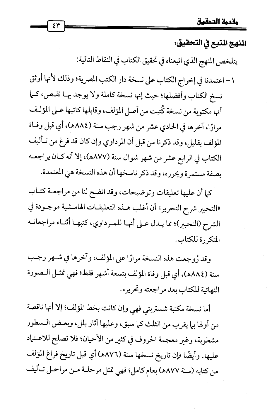 1 - اعتمدنا في إخراج الكتاب على نسخة دار الكتب المصرية؛ وذلك لأنها أوثق نسخ الكتاب وأفضلها؛ حيث إنها نسخة كاملة ولا يوجد بها نقص، كما أنها مكتوبة من نسخة كُتبت من أصل المؤلف، وقابلها كاتبها على المؤلف مرارًا، آخرها في الحادي عشر من شهر رجب سنة (884 هـ)، أي قبل وفاة المؤلف بقليل، وقد ذكرنا من قبل أن المرداوي وإن كان قد فرغ من تأليف الكتاب في الرابع عشر من شهر شوال سنة (877 هـ)، إلا أنه كان يراجعه بصفة مستمرة ويحرره، وقد ذكر ناسخها أن هذه النسخة هي المعتمدة.
