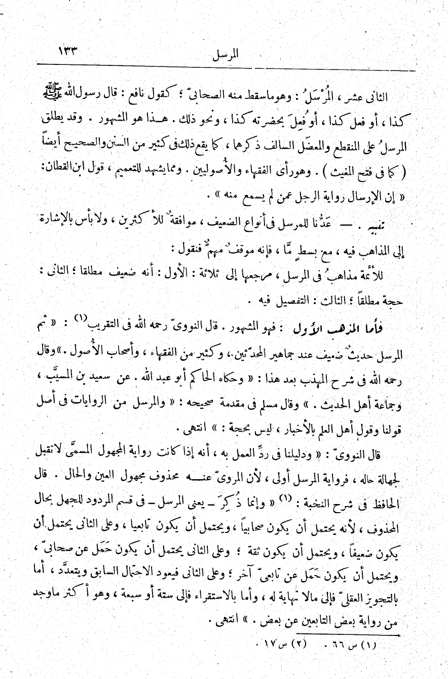 الثاني عشر، المرسل: وهو ما سقط منه الصحابي؛ كقول نافع قال رسول الله -صلى الله عليه وسلم- كذا أو فعل كذا. أو فُعِلَ بحضرته كذا ونحو ذلك هذا هو المشهور. وقد يطلق المرسل على المقطع والمعضل السالف ذكرهما، كما يقع ذلك في كثير من السنن والصحيح أيضًا "كما في فتح المغيث". وهو رأي الفقهاء والأصوليين. ومما يشهد للتعميم، قول ابن القطان: "إن الإرسال رواية الرجل عمن لم يسمع منه".