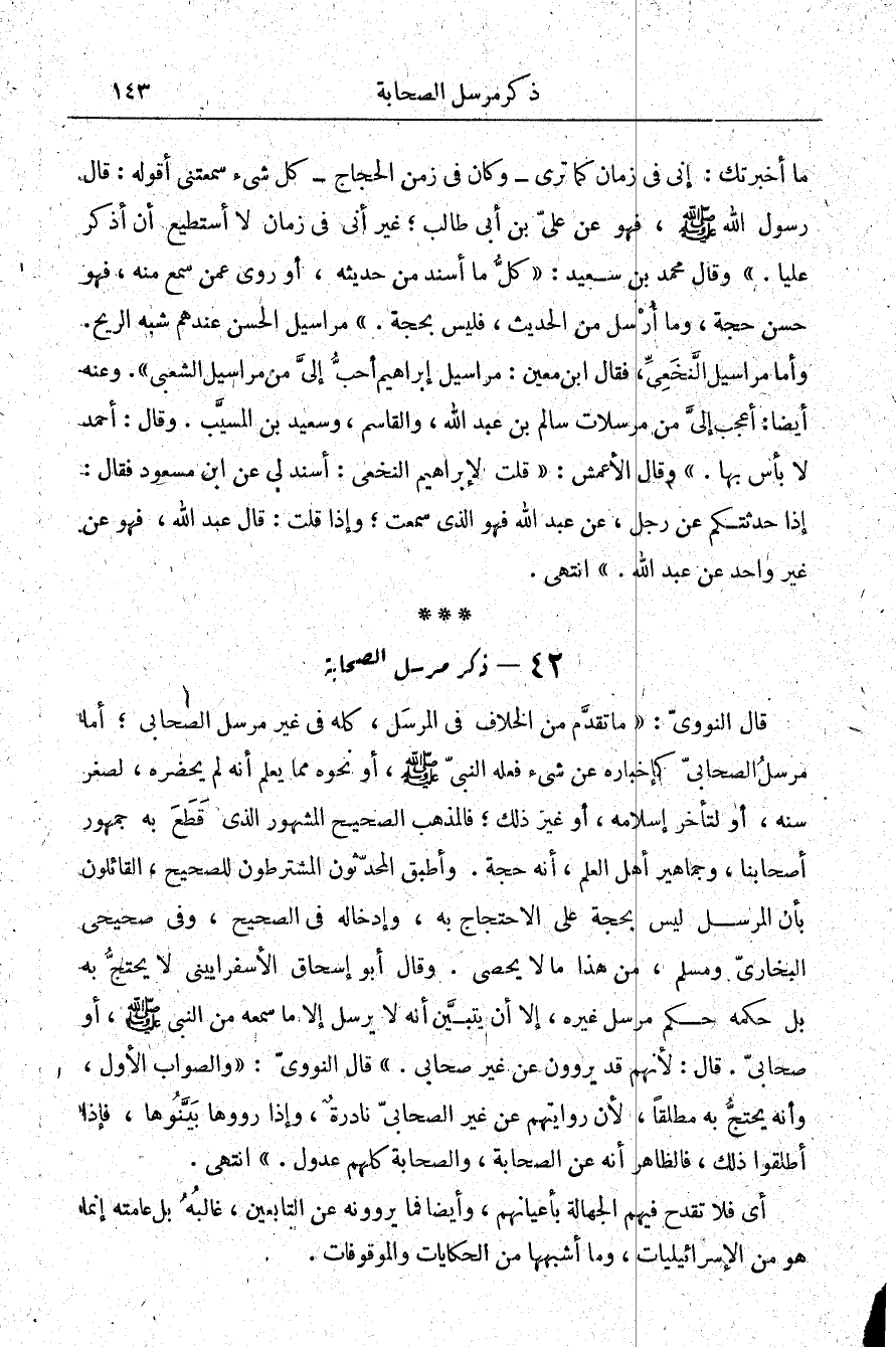 قال النووي: "ما تقدم من الخلاف في المرسل، كله في غير مرسل الصحابي؛ أما مرسل الصحابي كإخباره عن شيء فعله النبي -صلى الله عليه وسلم- أو نحوه مما يعلم أنه لم يحضره، لصغر سنه، أو لتأخر إسلامه أو غير ذلك؛ فالمذهب الصحيح المشهور الذي قطع به جمهور أصحابنا وجماهير أهل العلم أنه حجة، وأطبق المحدثون المشترطون للصحيح القائلون بأن المرسل ليس بحجة على الاحتجاج به. وإدخاله في الصحيح وفي صحيحي البخاري، ومسلم من هذا ما لا يحصى، وقال أبو إسحاق الإسفراييني لا يحتج به بل حكمه حكم مرسل غيره إلا أن يتبين أنه لا يرسل إلا ما سمعه من النبي -صلى الله عليه وسلم- أو صحابي. قال: لأنهم قد يروون عن غير صحابي. قال النووي: "والصواب الأول وأنه يحتج به مطلقًا لأن روايتهم عن غير الصحابي، نادرة وإذا رووها بينوها فإذا أطلقوا ذلك فالظاهر أنه عن الصحابة، والصحابة كلهم عدول". ا. هـ.