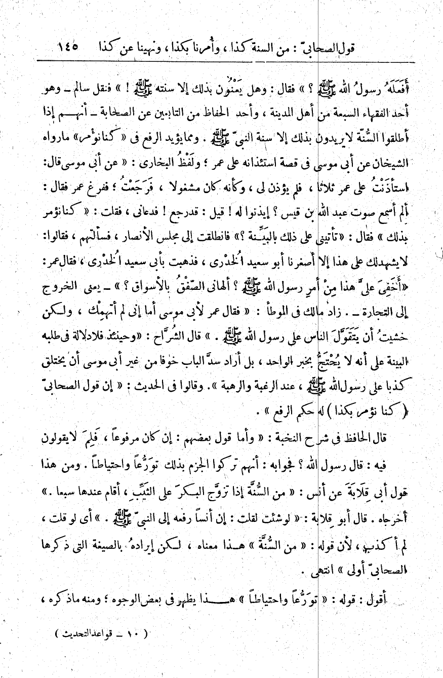 أفعله رسول الله -صلى الله عليه وسلم؟ " فقال: وهل يعنون بذلك إلا سنته -صلى الله عليه وسلم!. فنقل سالم -وهو أحد الفقهاء السبعة من أهل المدينة، وأحد الحفاظ من التابعين عن الصحابة- أنهم إذا أطلقوا السنة لا يريدون بذلك إلا سنة النبي -صلى الله عليه وسلم. ومما يؤيد الرفع في: "كنا نؤمر" ما رواه الشيخان عن أبي موسى في قصة استئذانه على عمر؛ ولفظ البخاري: "عن أبي موسى قال استأذنت على عمر؛ ثلاثا فلم يؤذن لي وكأنه كان مشغولا فرجعت ففرغ عمر فقال: ألم أسمع صوت عبد الله بن قيس؟ إيذنوا له! قيل: قد رجع فدعاني فقلت: "كنا نؤمر بذلك" فقال: "تأتيني على ذلك بالبينة؟ " فانطلقت إلى مجلس الأنصار، فسألتهم فقالوا: لا يشهد لك على هذا إلا أصغرنا أبو سعيد الخدري، فذهبت بأبي سعيد الخدري فذهبت بأبي سعيد الخدري فقال عمر: "أخفي عليَّ هذا من أمر رسول الله -صلى الله عليه وسلم- ألهاني الصفق بالأسواق" -يعنى الخروج إلى التجارية- زاد مالك في الموطأ: "فقال عمر لأبي موسى: أما إني لم أتهمك، ولكن خشيت أن يتقول الناس على رسول الله -صلى الله عليه وسلم" قال الشراح: "وحينئذ فلا دلالة في طلبه البينة على أنه لا يحتج بخبر الواحد بل أراد سد الباب خوفا من غير أبي موسى أن يختلق كذبا على رسول الله -صلى الله عليه وسلم- عند الرغبة والرهبة" وقالوا في بالحديث: "إن قول الصحابي "كنا نؤمر بكذا" له حكم الرفع".