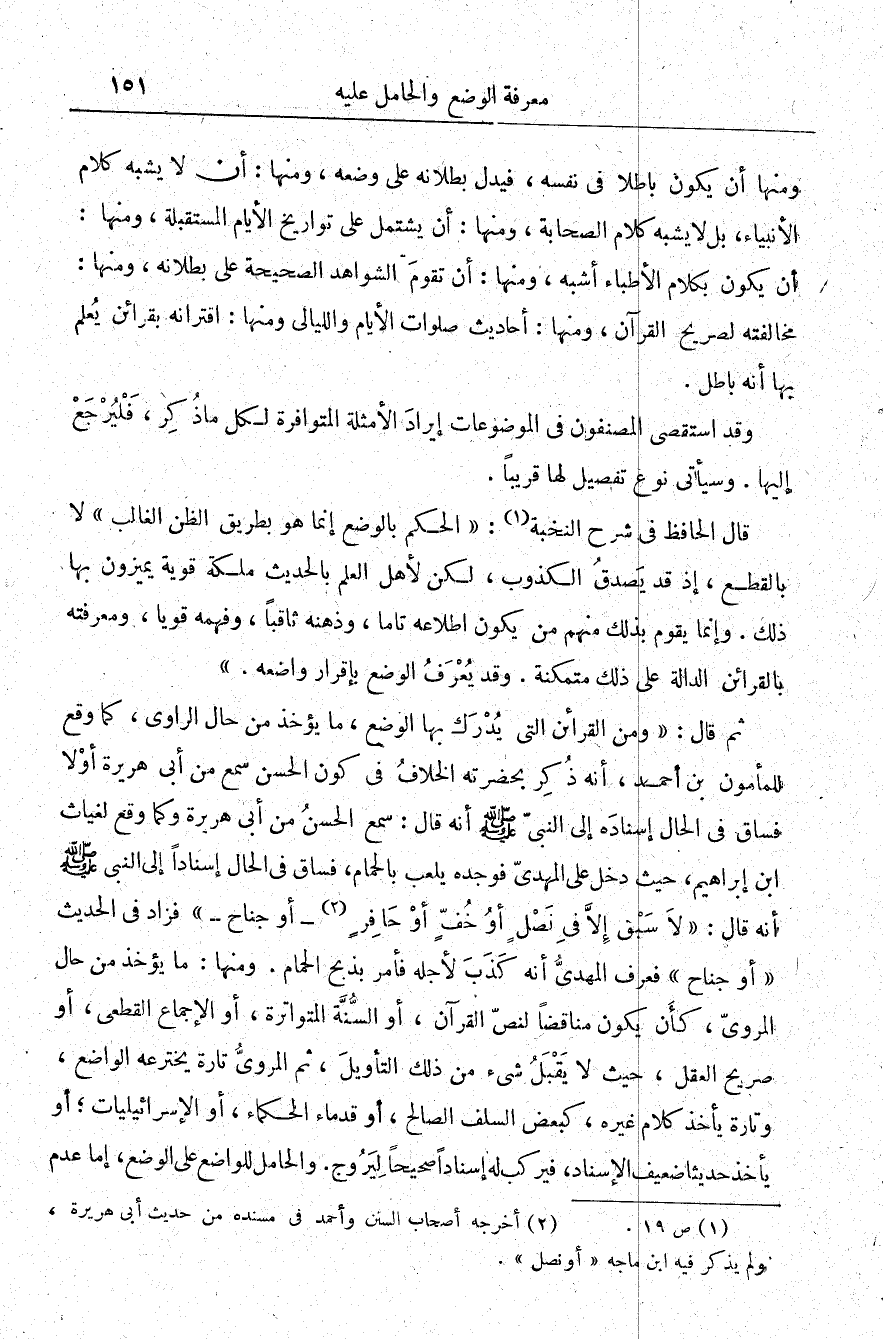 ومنها أن يكون باطلا في نفسه، فيدل بطلانه على وضعه، ومنها: أن لا يشبه كلام الأنبياء، بل لا يشبه كلام الصحابة، ومنها أن يشتمل على تواريخ الأيام المستقبلة، ومنها: أن يكون بكلام الأطباء أشبه، ومنها أن تقوم الشواهد الصحيحة على بطلانه، ومنها: مخالفته لصريح القرآن، ومنها: أحاديث صلوات الأيام والليالي، ومنها اقترانه بقرائن يعلم بها أنه باطل.