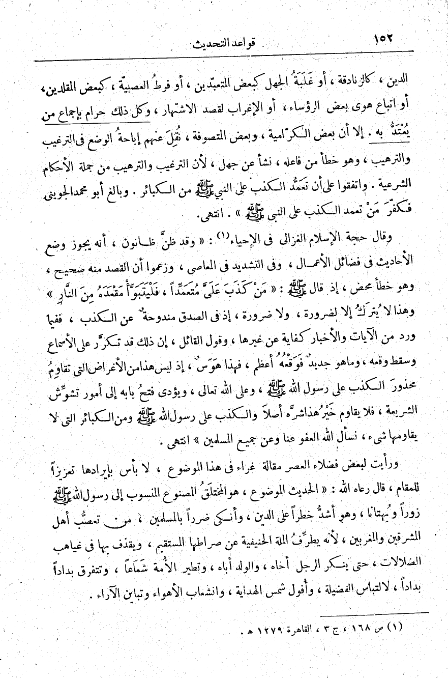 وقال حجة الإسلام الغزالي في الإحياء1: "وقد ظن ظانون، أنه يجوز وضع الأحاديث في فضائل الأعمال، وفي التشديد في المعاصي، وزعموا أن القصد منه صحيح، وهو خطأ محض؛ إذ قال -صلى الله عليه وسلم: "من كذب عليَّ متعمدًا، فليتبوأ مقعدة من النار" وهذا لا يترك إلا لضرورة، ولا ضرورة إذ في الصدق مندوحة عن الكذب ففيما، ورد من الآيات، والأخبار كفاية عن غيرها، وقول القائل إن ذلك قد تكرر على الأسماع، وسقط وقعه، وما هو جديد فوقعه أعظم فهذا هوس إذ ليس هذا من الأعراض التي تقاوم محذور الكذب على رسول الله -صلى الله عليه وسلم- وعلى الله تعالى ويؤدي فتح بابه إلى أمور تشوش الشريعة فلا يقاوم خير هذا شره أصلا، والكذب على رسول الله -صلى الله عليه وسلم- ومن الكبائر التي لا يقاومها شيء نسأل الله العفو عنه وعن جميع المسلمين". ا. هـ.