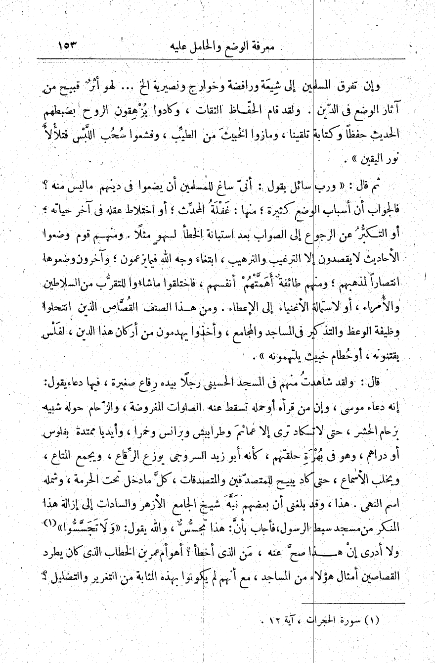 وإن تفرق المسلمين إلى شيعة ورافضة وخوارج ونصيرية إلخ ... لهو أثر قبيح من آثار الوضع في الدين. ولقد قام الحفاظ الثقات، وكادوا يزهقون الروح بضبطهم الحديث حفظًا وكتابة تلقينا، ومازوا الخبيث من الطيب، وقشعوا سحب اللبس فتلألأ نور اليقين".