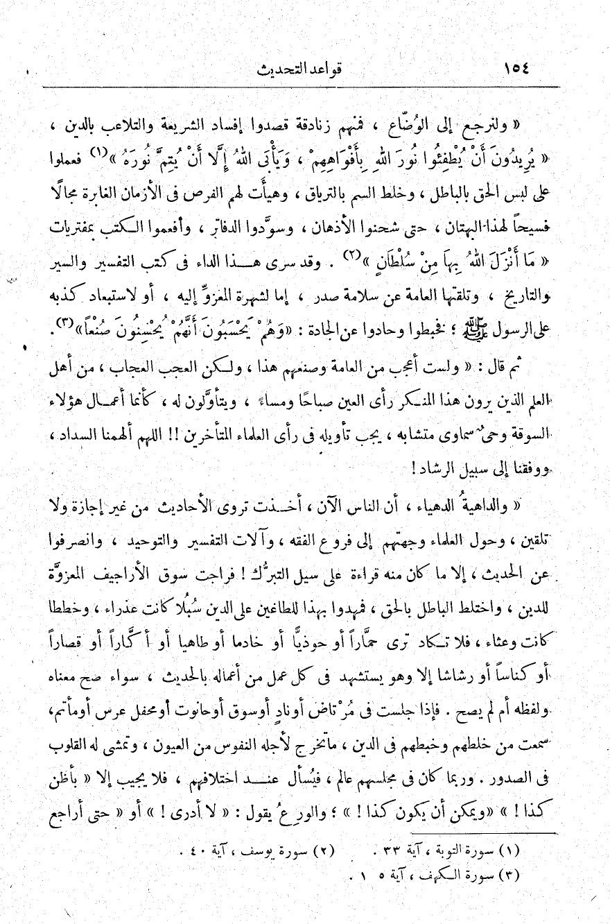 "والداهية الدهياء، أن الناس الآن، أخذت تروي الأحاديث من غير إجازة ولا تلقين، وحول العلماء وجهتهم إلى فروع الفقه، وآلات التفسير والتوحيد وانصرفوا عن الحديث إلا ما كان منه قراءة على سيل التبرك! فراجت سوق الأراجيف المعزوة للدين، واختلط الباطل بالحق فمهدوا بهذا للطاغين على الدين سبلا كان عذراء، وخططا كانت وعثاء فلا تكاد ترى حمارًا أو حوذيًّا أو خادما أو طاهيا أو أكارًا أو قصارًا أو كناسًا أو رشاشا إلا وهو يستشهد في كل عمل من أعماله بالحديث، سواء صح معناه ولفظه أم لم يصح. فإذا جلست في مرتاض أو ناد أو سوق أو حانوت أو محفل عرس أو مأتم سمعت من خلطهم وخبطهم في الدين ما تخرج لأجله النفوس من العيون وتمشي له القلوب في الصدور وربما كان في مجلسهم عالم فيسأل عند اختلافهم فلا يجيب إلا: "بأظن كذا! "؛ "ويمكن أن يكون كذا" والورع يقول: "لا أدري! " أو: "حتى أراجع