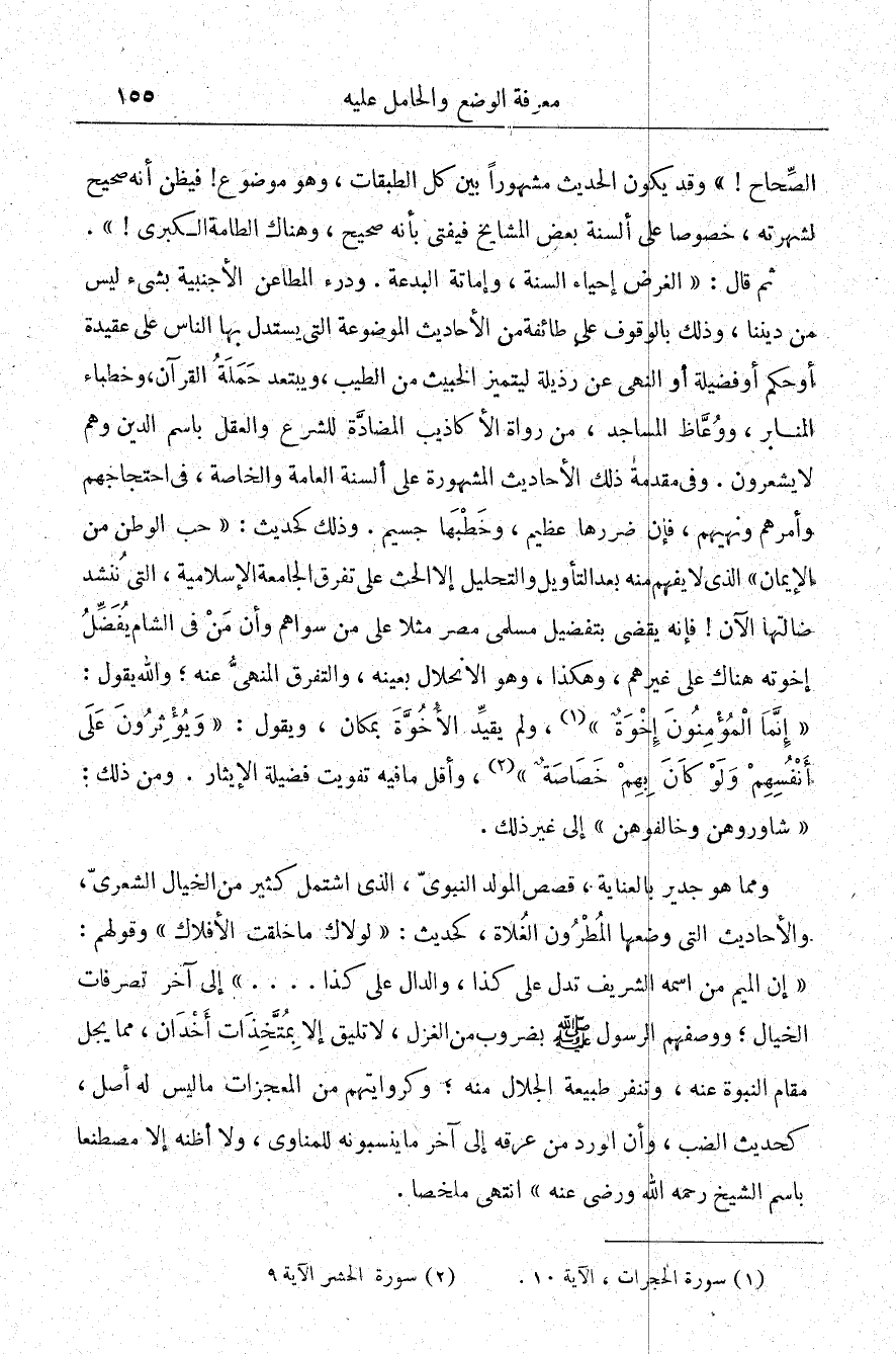 ثم قال: "الغرض إحياء السنة، وإماتة البدعة. ودرء المطاعن الأجنبية بشيء ليس من ديننا، وذلك بالوقوف على طائفة من الأحاديث الموضوعة التي يستدل بها الناس على عقيدة أو حكم أو فضيلة أو النهي عن رذيلة ليتميز الخبيث من الطيب، ويبتعد حملة القرآن وخطباء المنابر ووعاظ المساجد من رواة الأكاذيب المضادة للشرع والعقل باسم الدين وهم لا يشعرون، وفي مقدمة ذلك الأحاديث المشهورة على ألسنة العامة، والخاصة في احتجاجهم، وأمرهم ونهيهم فإن ضررها عظيم، وخطبها جسيم وذلك كحديث: "حب الوطن من الإيمان" الذي لا يفهم منه بعد التأويل والتحليل إلا الحث على تفرق الجامعة الإسلامية التي ننشد الإيمان" الذي لا يفهم منه بعد التأويل والتحليل إلا الحث على تفرق الجامعة الإسلامية التي ننشد ضالتها الآن فإنه يقضي بتفضيل مسلمي مصر مثلا على من سواهم وإن من في الشام يفضل إخوته هناك على غيرهم وهكذا وهو الانحلال بعينه والتفرق المنهي عنه والله يقول: {إِنَّمَا الْمُؤْمِنُونَ إِخْوَة} 1، ولم يقيد الأخوة بمكان ويقول: {وَيُؤْثِرُونَ عَلَى أَنْفُسِهِمْ وَلَوْ كَانَ بِهِمْ خَصَاصَة} 2، وأقل ما فيه تفويت فضيلة الإيثار ومن ذلك: "شاوروهن وخالفوهن" إلى غير ذلك.