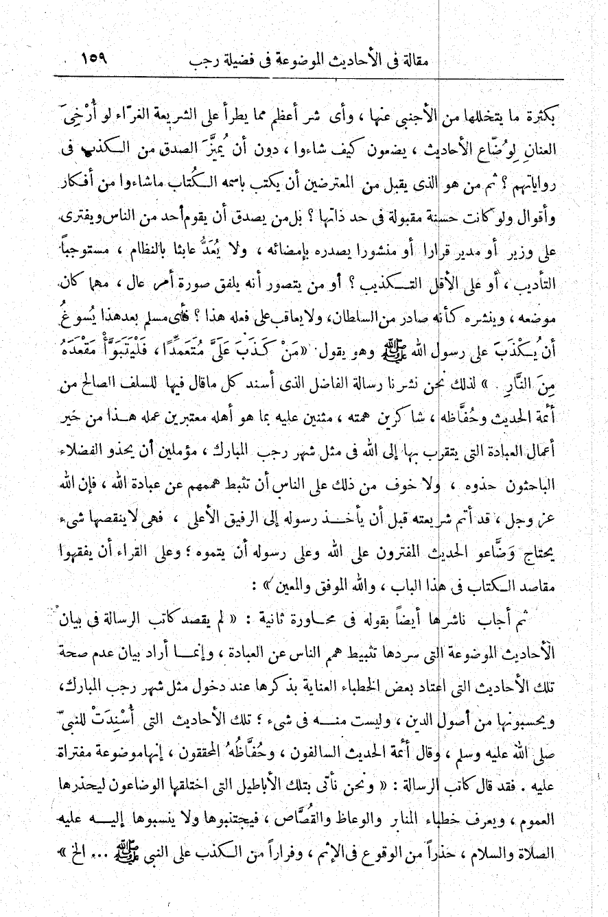 بكثرة ما يتخللها من الأجنبي عنها، وأي شر أعظم مما يطرأ على الشريعة الغراء لو أرخى العنان لوضاع الأحاديث، يضعون كيف شاءوا دون أن يميز الصدق من الكذب في رواياتهم، ثم من هو الذي يقبل من المعترضين أن يكتب باسمه الكتاب ما شاءوا من أفكار وأقوال ولو كانت حسنة مقبولة في حد ذاتها؟ بل من يصدق أن يقوم أحد من الناس ويفتري على وزير أو مدير قرارًا أو منشورا يصدره بإمضائه، ولا يعد عابثا بالنظام، متوجبًا التأديب أو على الأقل التكذيب؟ أو من يتصور أنه يلفق صورة أمر عال، مهما كان موضعه وينشره كأنه صادر من السلطان ولا يعاقب على فعله هذا فأي مسلم بعد هذا يسوغ أن يكذب على رسول الله -صلى الله عليه وسلم- وهو يقول: "من كذب عليَّ متعمدًا فليتبوأ مقعده من النار" لذلك نحن نشرنا رسالة الفاضل الذي أسند كل ما قال فيها للسلف الصالح من أئمة الحديث وحفاظه شاكرين همته، مثنين عليه بما هو أهله معتبرين عمله هذا من خير أعمال العبادة التي يتقرب بها إلى الله في مثل شهر رجب المبارك، مؤملين أن يحذو الفضلاء الباحثون حذوه، ولا خوف من ذلك على الناس أن تثبط هممهم عن عبادة الله، فإن الله عز وجل، قد أتم شريعته قبل أن يأخذ رسوله إلى الرفيق الأعلى، فهي لا ينقصها شيء يحتاج وضاعو الحديث المفترون على الله وعلى رسوله أن يتموه وعلى القراء أن يفقهوا مقاصد الكتاب في هذا الباب والله الموفق والمعين.