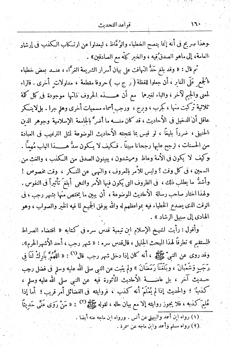 وأقول: رأيت لشيخ الإسلام ابن تيميه قدس سره في كتابه: "اقتضاء الصراط المستقيم" تطرقًا لهذا المبحث الجليل، قال قدس سره: "شهر رجب، أحد الأشهر الحرم". وقد روي عن النبي -صلى الله عليه وسلم- أنه كان إذا دخل شهر رجب قال1: "اللهم بارك لنا في رجب وشعبان، وبلغنا رمضان" ولم يثبت عن النبي في فضل رجب حديث آخر، بل عامة الأحاديث المأثورة فيه عن النبي -صلى الله عليه وسلم- كذب والحديث إذا لم يعلم أنه كذب فروايته في الفضائل أمر قريب أما إذا علم كذبه فلا يجوز روايته إلا مع بيان حاله لقوله -صلى الله عليه وسلم2: "من روى عني حديثًا