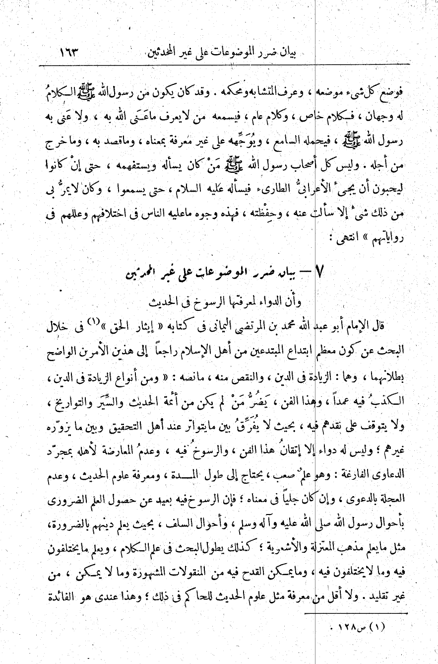 قال الإمام أبو عبد الله محمد بن المرتضى اليماني في كتابه: "إيثار الحق"1 في خلال البحث عن كون معظم ابتداع المبتدعين من أهل الإسلام راجعًا إلى هذين الأمرين الواضح بطلانهما وهما: الزيادة في الدين والنقص منه، ما نصه: "من أنواع الزيادة في الدين، الكذب فيه عمدًا، وهذا الفن يضر من لم يكن من أئمة الحديث والسير والتواريخ، ولا يتوقف على نقدهم فيه بحيث لا يفرق بين ما يتواتر عند أهل التحقيق، وبين ما يزوره غيرهم وليس له دواء إلا إتقان هذا الفن، والرسوخ فيه وعدم المعارضة لأهله بمجرد الدعاوي الفارغة، وهو علم صعب يحتاج إلى طول المدة، ومعرفة علوم الحديث، وعدم العجلة بالدعوى، وإن كان جليًّا في معناه فإن الرسوخ فيه بعيد عن حصول العلم الضروري بأحوال رسول الله -صلى الله عليه وسلم- وأحوال السلف بحيث يعلم دينهم بالضروة. مثل ما يعلم مذهب المعتزلة والأشعرية كذلك يطول البحث في علم الكلام ويعلم ما يختلفون فيه وما لا يختلفون فيه، وما يمكن القدح فيه من المنقولات المشهورة، وما لا يمكن من غير تقليد ولا أقل من معرفة مثل علوم الحديث للحاكم في ذلك وهذا عندي هو الفائدة