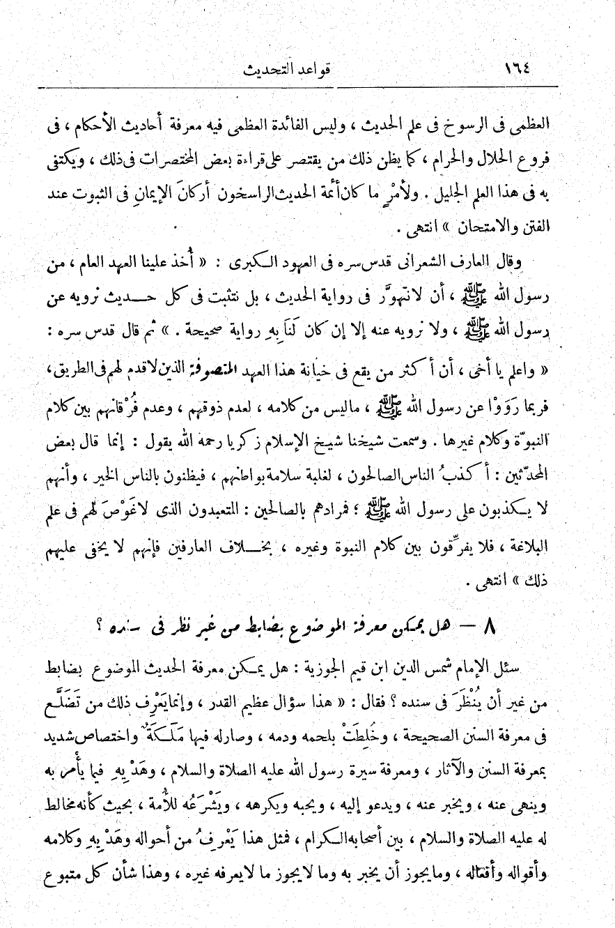 وقال العارف الشعراني قدس سره في العهود الكبرى: "أخذ علينا العهد العام من رسول الله -صلى الله عليه وسلم- أن لا نتهور في رواية الحديث بل نتثبت في كل حديث نرويه عن رسول الله -صلى الله عليه وسلم- ولا نرويه عنه إلا إن كان لنا به رواية صحيحة" ثم قال قدس سره: "واعلم يا أخي أن أكثر من يقع في خيانة هذا العهد المتصوفة الذين لا قدم لهم في الطريق فربما رووا عن رسول الله -صلى الله عليه وسلم- ما ليس من كلامه لعدم ذوقهم، وعدم فرقانهم بين كلام النبوة، وكلام غيرها، وسمعت شيخنا شيخ الإسلام زكريا رحمه الله يقول إنما قال بعض المحدثين: أكذب الناس الصالحون لغلبة سلامة بواطنهم فيظنون بالناس الخير، وأنهم لا يكذبون على رسول الله -صلى الله عليه وسلم- فمرادهم بالصالحين المتعبدون الذي لا غوص لهم في علم البلاغة، فلا يفرقون بين كلام النبوة، وغيره بخلاف العارفين فإنهم لا يخفى عليهم ذلك". ا. هـ.