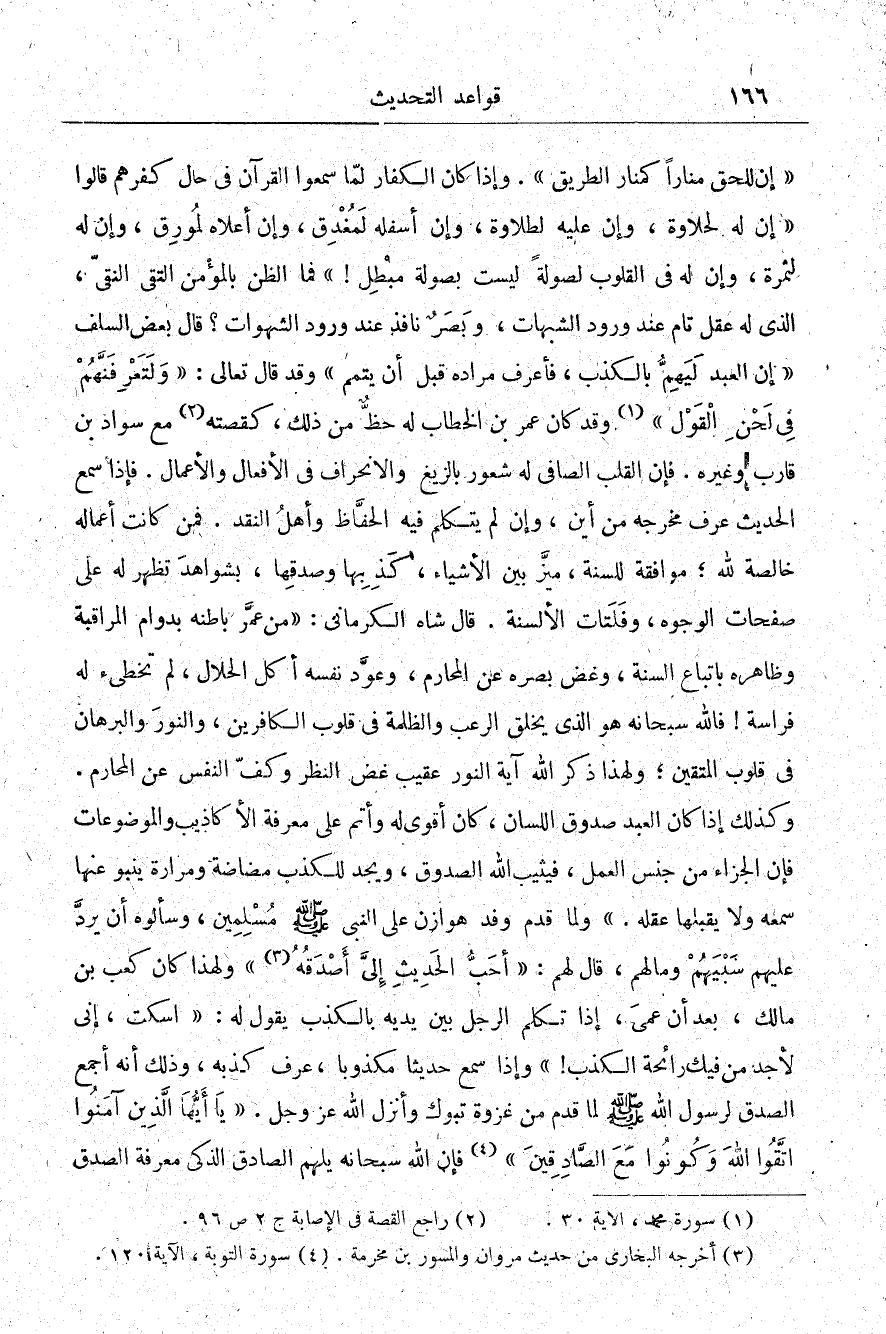 "إن للحق منارًا كمنار الطريق". وإذا كان الكفار لما سمعوا القرآن في حال كفرهم قالوا: "إن له لحلاوة، وإن عليه لطلاوه، وإن أسفله لمغدق وإن أعلاه لمورق وإن له لثمرة، وإن له في القلوب لصولة ليست بصوله مبطل! " فما الظن بالمؤمن التقي النقي، الذي له عقل تام عند ورود الشبهات، وبصر نافذ عند ورود الشهوات؟ قال بعض السلف: "إن العبد ليهم بالكذب فأعرف مراده قبل أن يتمم" وقد قال تعالى: {وَلَتَعْرِفَنَّهُمْ فِي لَحْنِ الْقَوْلِ} 1 وقد كان عمر بن الخطاب له حظ من ذلك كقصته2 مع سواد بن قارب وغيره. فإن القلب الصافي له شعور بالزيغ والانحراف في الأفعال والأعمال. فإذا سمع الحديث عرف مخرجه من أين، وإن لم يتكلم فيه الحفاظ وأهل النقد. فمن كانت أعماله خالصة لله موافقة للسنة ميز بين الأشياء، كذبها وصدقها، بشواهد تظهر له على صفحات الوجوه وفلتات الألسنة. قال شاه الكرماني: "من عمر باطنة بدوام المراقبة وظاهره باتباع السنة، وغض بصره عن المحارم، وعود نفسه أكل الحلال لم تخطئ له فراسة فالله سبحانه هو الذي يخلق الرعب والظلمة في قلوب الكافرين، والنور والرهان في قلوب المتقين، ولهذا ذكر الله آية النور عقيب غض النظر، وكف النفس عن المحارم. وكذلك إذا كان العبد صدوق اللسان، كان أقوى له وأتم على معرفة الأكاذيب والموضوعات فإن الجزاء من جنس العمل، فيثيب الله الصدوق ويجد للكذب مضاضة ومرارة ينبو عنها سمعه ولا يقبلها عقله". ولما قدم وفد هوازن على النبي -صلى الله عليه وسلم- مسلمين وسألوه أن يرد عليهم سبيهم ومالهم قال لهم: "أحب الحديث إلى أصدقه" 3 ولهذا كان كعب بن مالك، بعد أن عمي، إذا تلكم الرجل بين يديه بالكذب يقول له: "اسكت، إني لأجد من فيك رائحة الكذب! " إذا سمع حديثا مكذوبا، عرف كذبه وذلك أنه أجمع الصدق لرسول الله -صلى الله عليه وسلم- لما قدم من غزوة تبوك وأنزل الله عز وجل {يَا أَيُّهَا الَّذِينَ آمَنُوا اتَّقُوا اللَّهَ وَكُونُوا مَعَ الصَّادِقِينَ} 4 فإن الله سبحانه يلهم الصادق الذكي معرفة الصدق