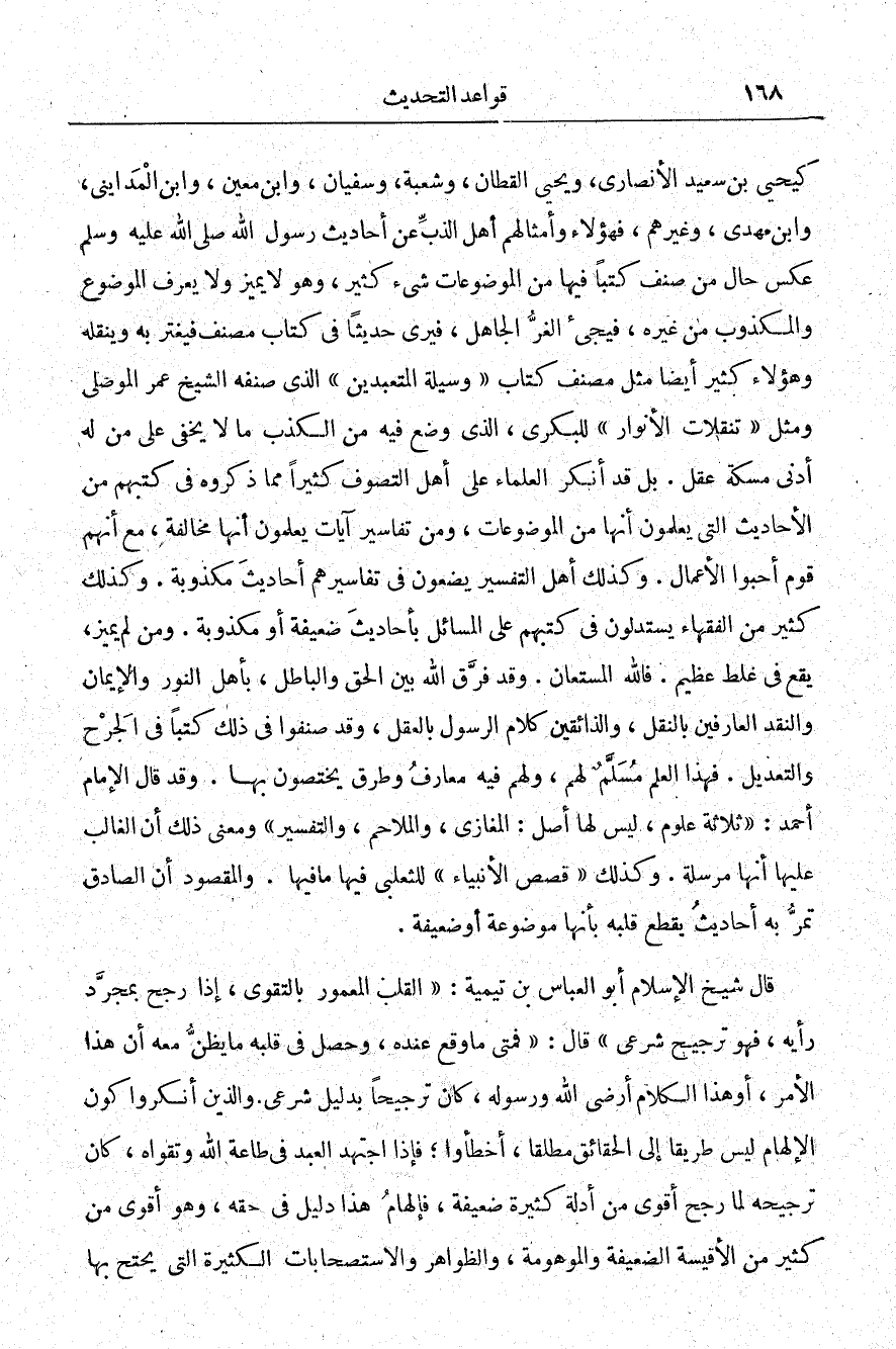 كيحيى بن سعيد الأنصاري ويحيى القطان وشعبة وسفيان وابن معين وابن المدايني وابن مهدي وغيرهم فهؤلاء وأمثالهم أهل الذب عن أحاديث رسول الله -صلى الله عليه وسلم- عكس حال من صنف كتبًا فيها من الموضوعات شيء كثير، وهو لا يميز ولا يعرف الموضوع والمكذوب من غيره فيجيء الغر الجاهل فيرى حديثًا في كتاب مصنف فيغتر به وينقله وهؤلاء كثير أيضًا مثل مصنف كتاب: "وسيلة المتعبدين" الذي صنفه الشيخ عمر الموصلي ومثل: "تنقلات الأنوار" للبكري الذي وضع فيه من الكذب ما لا يخفى على من له أدنى مسكة عقل، بل قد أنكر العلماء على أهل التصوف كثيرًا مما ذكروه في كتبهم من الأحاديث التي يعلمون أنها من الموضوعات، ومن تفاسير آيات يعلمون أنها مخالفة مع أنهم قوم أحبوا الأعمال، وكذلك أهل التفسير يضعون في تفاسيرهم أحاديث مكذوبة، وكذلك كثير من الفقهاء يستدلون في كتبهم على المسائل بأحاديث ضعيفة أو مكذوبة، ومن لم يميز يقع في غلط عظيم فالله المستعان، وقد فرق الله بين الحق والباطل بأهل النور والإيمان والنقد العارفين بالنقل والذائقين كلام الرسول بالعقل، وقد صنفوا في ذلك كتبًا في الجرح والتعديل فهذا العلم مسلم لهم ولهم فيه معارف وطرق يختصون بها. وقد قال الإمام أحمد: "ثلاثة علوم ليس لها أصل: المغازي والملاحم والتفسير" ومعنى ذلك أن الغالب عليها أنها مرسلة وكذلك: "قصص الأنبياء" للثعلبي فيها ما فيها. والمقصود أن الصادق تمر به أحاديث يقطع قلبه بأنها موضوعة أو ضعيفة.