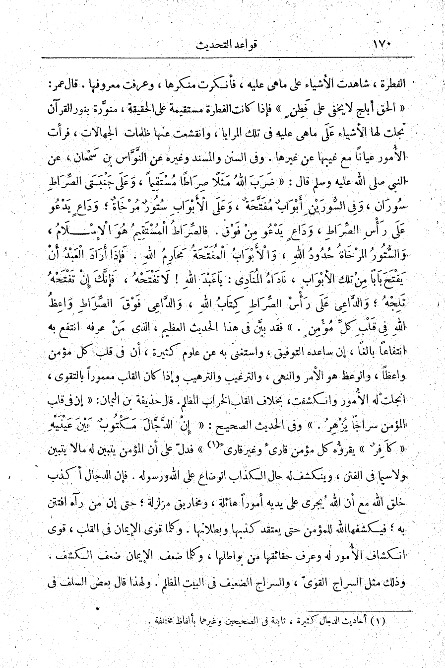 الفطرة، شاهدت الأشياء على ما هي عليه فأنكرت منكرها، وعرفت معروفها. قال عمر: "الحق أبلج لا يخفى على فطن" فإذا كانت الفطرة مستقيمة على الحقيقة منورة بنور القرآن تجلت لها الأشياء على ما هي عليه في تلك المرايا، وانقشعت عنها ظلمات الجهالات فرأت الأمور عيانًا مع غيبها عن غيرها، وفي السنن والمسند، وغيره عن النواس بن سمعان عن النبي قال: "ضرب الله مثلًا صراطًا مستقيمًا، وعلى جنبتي الصراط سوران، وفي السورين أبواب مفتحة، وعلى الأبواب ستور مرخاة، وداع يدعو على رأس الصراط، وداع يدعو من فوق فالصراط المستقيم هو الإسلام، والستور المرخاة حدود الله والأبواب المفتحة محارم الله فإذا أراد العبد أن يفتح بابًا من تلك الأبواب ناداه المنادى يا عبد الله لا تفتحه، فإنك إن تفتحه تلجه؛ والداعي على رأس الصراط كتاب الله، والداعي فوق الصراط، واعظ الله في قلب كل مؤمن" فقد بين هذا الحديث العظيم الذي من عرفه انتفع به انتفاعًا بالغًا إن ساعده التوفيق، واستغنى به عن علوم كثيرة أن في قلب كل مؤمن واعظًا والوعظ هو الأمر والنهى والترغيب والترهيب، وإذا كان القلب معمورًا بالتقوى انجلت له الأمور وانكشفت بخلاف القلب الخراب المظلم قال حذيفة بن اليمان: "إن في قلب المؤمن سراجًا يزهر" وفي الحديث الصحيح: "إن الدجال مكتوب بين عينيه: "كافر" يقرؤه كل مؤمن قارئ وغير قارئ" 1 فدل على أن المؤمن يتبين له ما لا يتبين، ولا سيما في الفتن وينكشف له حال الكذاب الوضاع على الله ورسوله. فإن الدجال أكذب خلق الله مع أن الله يجري على يديه أمورًا هائلة، ومخاريق مزلزلة؛ حتى إن من رآه افتتن به؛ فيكشفها الله للمؤمن حتى يعتقد كذبها وبطلانها. وكلما قوي الإيمان في القلب قوي انكشاف الأمور له، وعرف حقائقها من بواطلها، وكلما ضعف الإيمان ضعف الكشف. وذلك مثل السراج القوي والسراج الضعيف في البيت المظلم ولهذا قال بعض السلف في