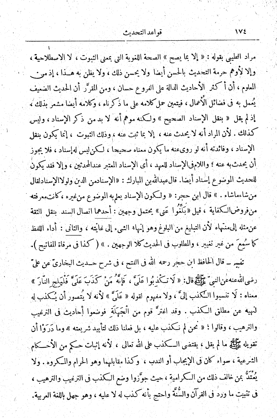 مراد الطيبي بقوله: "إلا بما يصح" الصحة اللغوية التي بمعنى الثبوت لا الاصطلاحية، وإلا لأوهم حرمة التحديث بالحسن أيضا، ولا يحسن ذلك ولا يظن به هذا إذ من المعلوم أن أكثر الأحاديث الدالة على الفروع حسان، ومن المقرر أن الحديث الضعيف يعمل به في فضائل الأعمال فيتعين حمل كلامه على ما ذكرناه، وكلامه أيضًا مشعر بذلك إذ لم يقل: "بنقل الإسناد الصحيح" ولكنه موهم أنه لا بد من ذكر الإسناد وليس كذلك لأن المراد أنه لا يحدث عنه إلا بما ثبت عنه، وذلك الثبوت إنما يكون بنقل الإسناد وفائدته أنه لو روى عنه ما يكون معناه صحيحا، لكن ليس له إسناد فلا يجوز أن يحدث به عنه واللام في الإسناد للعهد أي الإسناد المعتبر عند المحدثين، وإلا فقد يكون للحديث الموضوع إسناد أيضًا قال عبد الله بن المبارك: "الإسناد من الدين ولو الإسناد لقال من شاء ما شاء" قال ابن حجر: "ولكون الإسناد يعلم به بالموضوع من غيره كانت معرفته من فروض الكفاية قيل: "بلغوا عني" يحتمل وجهين: أحدهما اتصال السند بنقل الثقة عن مثله إلى منتهاه لأن التبليغ من البلوغ وهو إنهاء الشيء إلى غايته، والثاني: أداء اللفظ كما سمع من غير تغيير، والمطلوب في الحديث كلا الوجهين". "كذا في مرقاة المفاتيح".