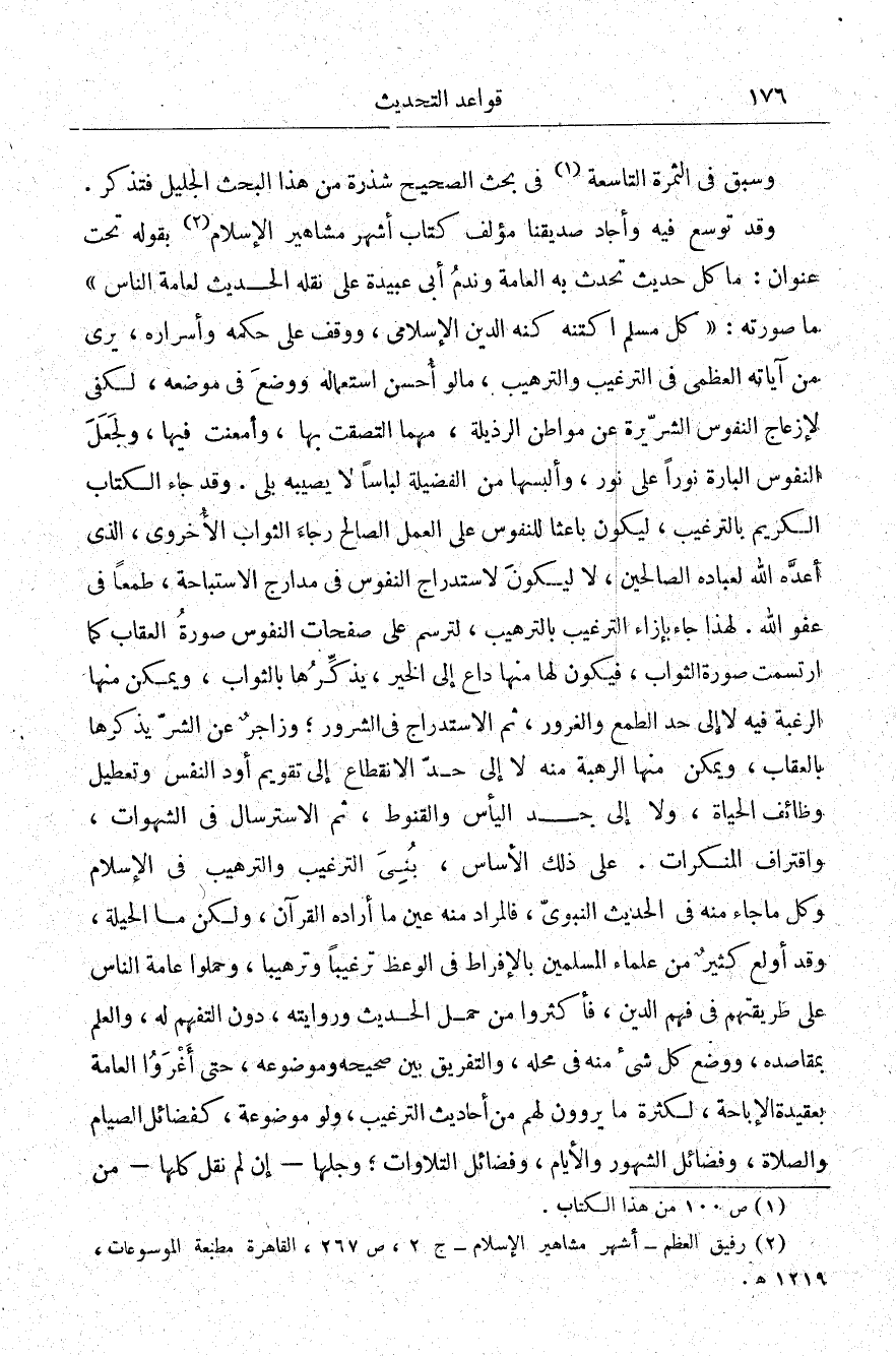 وقد توسع فيه وأجاد صديقنا مؤلف كتاب أشهر مشاهير الإسلام2 بقوله تحت عنوان ما كل حديث تحدث به العامة، وندم أبي عبيدة على نقله الحديث لعامة الناس ما صورته: "كل مسلم أكتنه كنه الدين الإسلامي، ووقف على حكمه وأسراره، يرى من آياته العظمى في الترغيب، والترهيب، ما لو أحسن استعماله ووضع في موضعه، لكفى لإزعاج النفوس الشريرة عن مواطن الرذيلة مهما التصقت بها وأمعنت فيها، ولجعل النفوس البارة نورًا على نور، وألبسها من الفضيلة لباسًا لا يصيبه بلى، وقد جاء الكتاب الكريم بالترغيب ليكون باعثا للنفوس على العمل الصالح رجاء الثواب الأخروي الذي أعده الله لعباده الصالحين لا ليكون لاستدراج النفوس في مدارج الاستباحة طمعًا في عفو الله لهذا جاء بإزاء الترغيب بالترهيب لترسم على صفحات النفوس صورة العقاب، كما ارتسمت صورة الثواب فيكون لها منها داع إلى الخير يذكرها بالثواب، ويمكن منها الرغبة فيه لا إلى حد الطمع، والغرور ثم الاستدراج في الشرور وزاجر عن الشر يذكرها بالعقاب، ويمكن منها الرهبة منه لا إلى حد الانقطاع إلى تقويم أود النفس وتعطيل وظائف الحياة ولا إلى حد اليأس والقنوط ثم الاسترسال في الشهوات واقتراف المنكرات على ذلك الأساس بني الترغيب والترهيب في الإسلام وكل ما جاء منه في الحديث النبوي فالمراد منه عين ما أراده القرآن، ولكن ما الحيلة وقد أولع كثير من علماء المسلمين بالإفراط في الوعظ ترغيبًا وترهيبًا وحملوا عامة الناس على طريقتهم في فهم الدين فأكثروا من حمل الحديث وروايته دون التفهم له والعلم بمقاصده ووضع كل شيء منه في محله، والتفريق بين صحيحه وموضوعه حتى أغروا العامة بعقيدة الإباحة لكثرة ما يروون لهم من أحاديث الترغيب ولو موضوعه كفضائل الصيام والصلاة وفضائل الشهور والأيام وفضائل التلاوات وجلها -إن لم نقل كلها- من