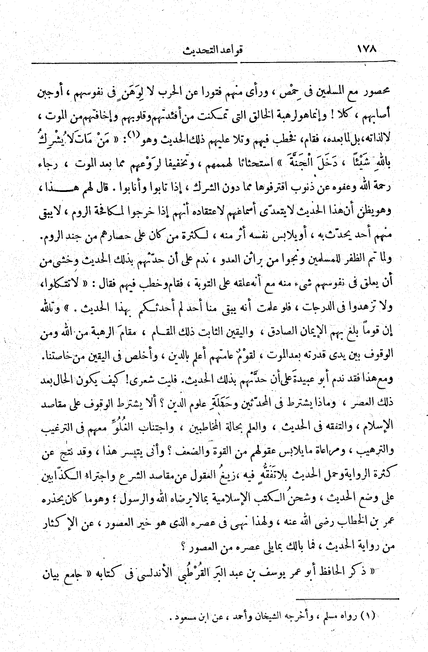 محصور مع المسلمين في حمص، ورأى منهم فتورا عن الحرب لا لوهن في نفوسهم، أو جبن أصابهم كلا! وإنما هو لرهبة الخالق التي تمكنت من أفئدتهم وقلوبهم وإخافتهم من الموت، لا لذاته، بل لما بعده، فقام فخطب فيهم وتلا عليهم ذلك الحديث وهو1: $"من مات لا يشرك بالله شيئًا دخل الجنة" استحثاثا لهممهم، وتخفيفا لروعهم مما بعد الموت، رجاء رحمه الله وعفوه عن ذنوب اقترفوها مما دون الشرك إذا تابوا، وأنابوا قال لهم هذا وهو يظن أن هذا الحديث لا يتعدى أسماعهم لاعتقاده أنهم إذا خرجوا لمكافحة الروم لا يبقى منهم أحد يحدث به، أو يلابس نفسه أثر منه لكثرة من كان على حصارهم من جند الروم، ولما تم الظفر للمسلمين ونجوا من براثن العدو ندم على أن حدثهم بذلك الحديث وخشي من أن يعلق في نفوسهم شيء منه مع أنه علقه على التوبة، فقام وخطب فيهم فقال: لا تتكلوا ولا تزهدوا في الدرجات فلو علمت أنه يبقى منا أحد لم أحدثكم بهذا الحديث. وتالله إن قومًا بلغ بهم الإيمان الصادق، واليقين الثابت ذلك المقام مقام الرهبة من الله ومن الوقوف بين يدي قدرته بعد الموت لقوم عامتهم أعلم بالدين وأخلص في اليقين من خاصتنا ذلك العصر وماذا يشترط في المحدثين وحملة علوم الدين؟ ألا يشترط الوقوف على مقاصد الإسلام، والتفقه في الحديث والعلم بحالة الخاطبين واجتناب الغلو معهم في الترغيب والترهيب، ومراعاة ما يلابس عقولهم من القوة والضعف وأنى يتيسر هذا وقد نتج عن كثرة الرواية وحمل الحديث بلا تفقه فيه زيغ العقول عن مقاصد الشرع واجتراء الكذابين على وضع الحديث، وشحن الكتب الإسلامية بما لا يرضاه الله والرسول وهو ما كان يحذره عمر بن الخطاب -رضي الله عنه- ولهذا نهى في عصره الذي هو خير العصور عن الإكثار من رواية الحديث فما بالك بما يلي عصره من العصور؟