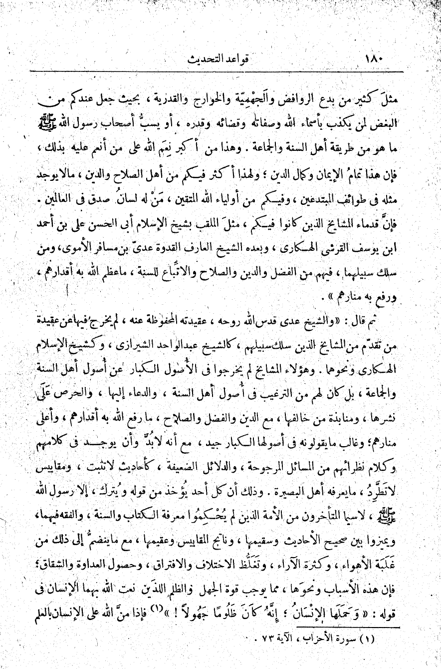 ثم قال: "والشيخ عدي قدس الله روحه، عقيدته المحفوظة عنه، لم يخرج فيها عن عقيدة من تقدم من المشايخ الذين سلك سبيلهم، كالشيخ عبد الواحد الشيرازي، وكشيخ الإسلام الهكاري ونحوهما. وهؤلاء المشايخ لم يخرجوا في الأصول الكبار عن أصول أهل السنة، والجماعة بل كان لهم من الترغيب في أصول أهل السنة، والدعاء إليها والحرص على نشرها، ومنابذة من خالفها مع الدين والفضل والصلاح ما رفع الله به أقدارهم، وأعلى منارهم وغالب ما يقولونه في أصولها الكبار جيد مع أنه لا بد وأن يوجد في كلامهم وكلام نظرائهم من المسائل المرجوحة والدلائل الضعيفة كأحاديث لا تثبت ومقاييس لا تطرد ما يعرفه أهل البصيرة وذلك أن كل أحد يؤخذ من قوله ويترك إلا رسول الله -صلى الله عليه وسلم- لا سيما المتأخرون من الأمة الذين لم يحكموا معرفة الكتاب والسنة والفقه فيهما ويميزوا بين صحيح الأحاديث وسقيمها وناتج المقاييس وعقيمها مع ما ينضم إلى ذلك من غلبة الأهواء وكثرة الآراء وتغلظ الاختلاف والافتراق وحصول العداوة والشقاق، فإن هذه الأسباب ونحوها مما يوجب قوة الجهل والظلم اللذين نعت الله بهما الإنسان في قوله: {وَحَمَلَهَا الْأِنْسَانُ إِنَّهُ كَانَ ظَلُومًا جَهُولًا} 1 فإذا مَنَّ الله على الإنسان بالعلم
