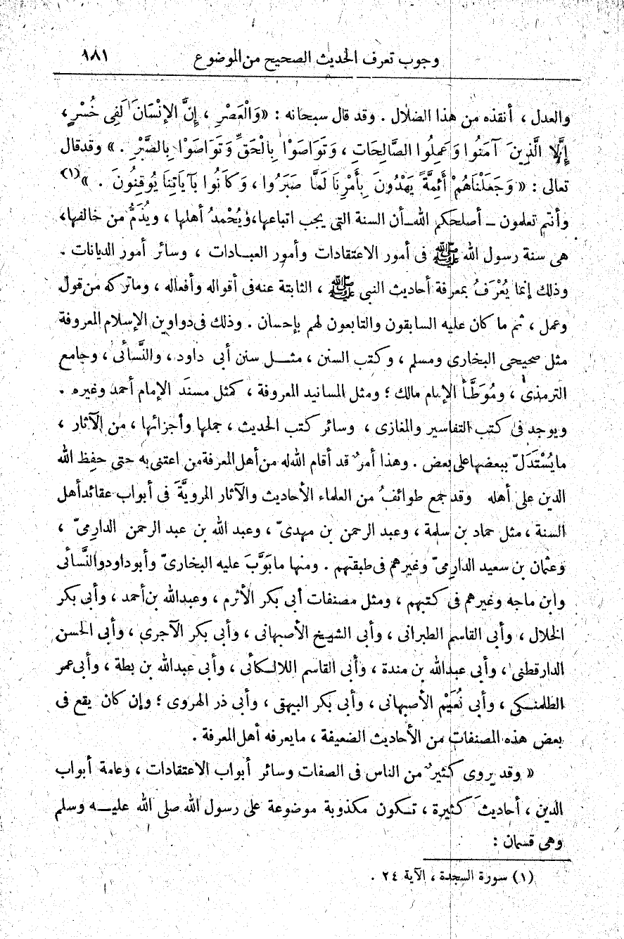 والعدل، أنقذه من هذا الضلال. وقد قال سبحانه: {وَالْعَصْرِ، إِنَّ الإنسانَ لَفِي خُسْرٍ، إِلَّا الَّذِينَ آمَنُوا وَعَمِلُوا الصَّالِحَاتِ وَتَوَاصَوْا بِالْحَقِّ وَتَوَاصَوْا بِالصَّبْر} . وقد قال تعالى: {وَجَعَلْنَا مِنْهُمْ أَئِمَّةً يَهْدُونَ بِأَمْرِنَا لَمَّا صَبَرُوا وَكَانُوا بِآيَاتِنَا يُوقِنُونَ} 1. وأنتم تعلمون -أصلحكم الله- أن السنة التي يجب اتباعها، ويحمد أهلها ويذم من خالفها هي سنة رسول الله -صلى الله عليه وسلم- في أمور الاعتقادات وأمور العبادات وسائر أمور الديانات. وذلك إنما يعرف بمعرفة أحاديث النبي -صلى الله عليه وسلم- الثابتة عنه في أقواله وأفعاله، وما تركه من قول وعمل ثم ما كان عليه السابقون والتابعون لهم بإحسان، وذلك في دواوين الإسلام المعروفة مثل صحيحي البخاري ومسلم وكتب السنن مثل سنن أبي داود والنسائي وجامع الترمذي وموطأ الإمام مالك، ومثل المسانيد المعروفة كمثل مسند الإمام أحمد وغيره ويوجد في كتب التفاسير والمغازي وسائر كتب الحديث جملها وأجزائها من الآثار ما يستدل ببعضها على بعض، وهذا أمر قد أقام الله له من أهل المعرفة من اعتنى به حتى حفظ الله الدين على أهله، وقد جمع طوائف من العلماء الأحاديث والآثار المروية في أبواب عقائد أهل السنة مثل حماد بن سلمة وعبد الرحمن بن مهدي وعبد الله بن عبد الرحمن الدارمي وعثمان بن سعيد الدارمي وغيرهم في طبقهم ومنها ما بوب عليه البخاري وأبو داود والنسائي وابن ماجه وغيرهم في كتبهم، ومثل مصنفات أبي بكر الأثرم وعبد الله بن أحمد وأبي بكر الخلال وأبي القاسم الطبراني وأبي الشيخ الأصبهاني وأبي بكر الآجري وأبي الحسن الدارقطني وأبي عبد الله بن منده وأبي القاسم اللالكائي وأبي عبد الله بن بطة وأبي عمر الطلمنكي وأبي نعيم الأصبهاني وأبي بكر البيهقي وأبي ذر الهروي، وإن كان يقع في بعض هذه المصنفات من الأحاديث الضعيفة ما يعرفه أهل المعرفة.