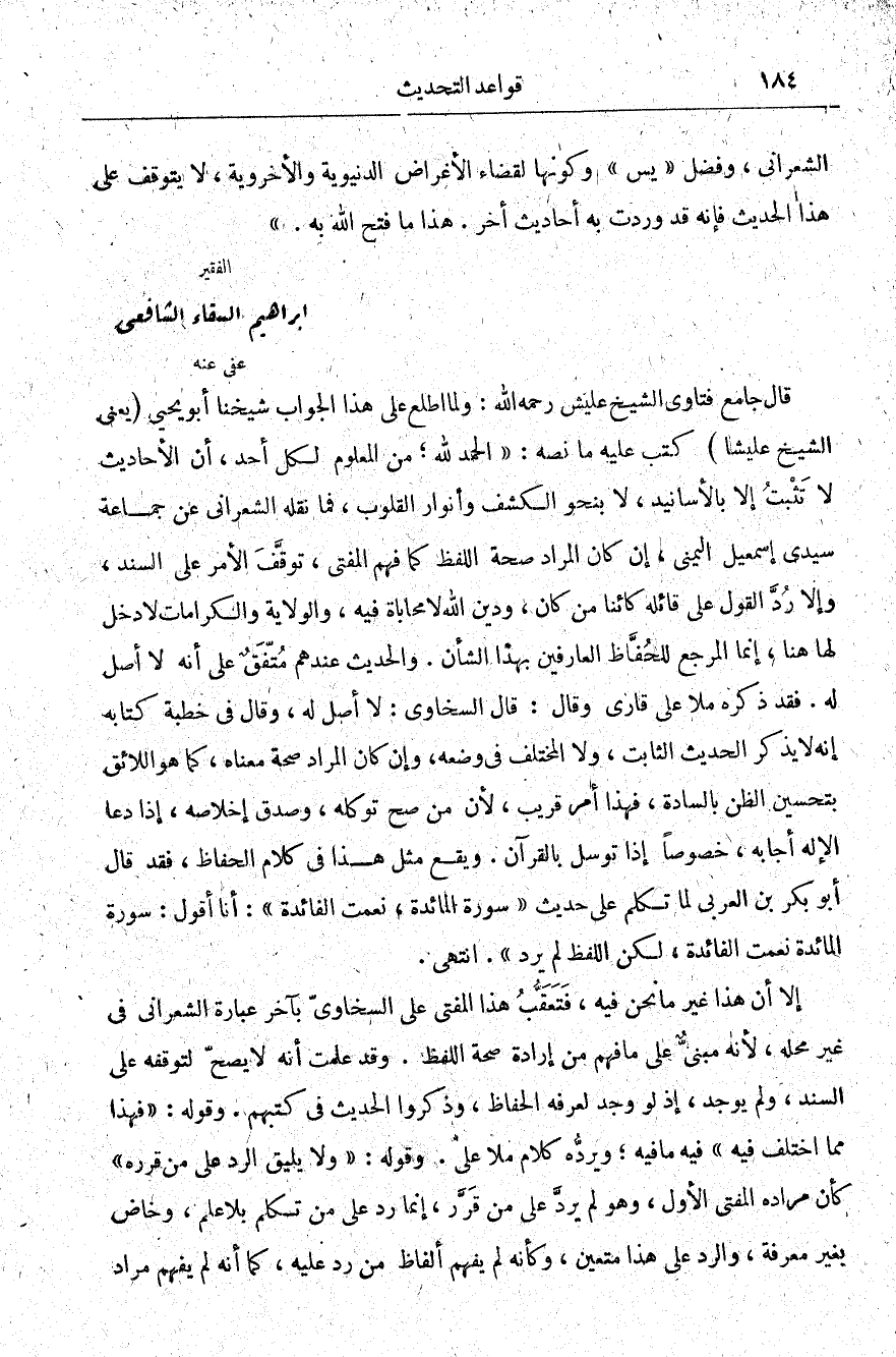 إلا أن هذا غير ما نحن فيه فتعقب هذا المفتي على السخاوي بآخر عبارة الشعراني في غير محله؛ لأنه مبني على ما فهم من إراده صحة اللفظ وقد علمت أنه لا يصح لتوقفه على السند ولم يوجد؛ إذ لو وجد لعرفه الحفاظ، وذكروا الحديث في كتبهم، وقوله: "فهذا مما اختلف فيه" فيه ما فيه ويرده كلام ملا علي. وقوله: "ولا يليق الرد على من قرره" كأن مراده المفتي الأول، وهو لم يرد على من قرر، إنما رد على من تكلم بلا علم وخاض بغير معرفة، والرد على هذا متعين وكأنه لم يفهم ألفاظ من رد عليه، كما أنه لم يفهم مراد