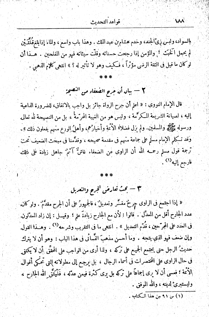قال الإمام النووي: اعلم أن جرح الرواة جائز، بل واجب بالاتفاق للضرورة الداعية إليه لصيانة الشريعة المكرمة، وليس هو من الغيبة المحرمة، بل من النصيحة لله تعالى ورسوله والمسلمين ولم يزل فضلاء الأئمة، وأخيارهم، وأهل الورع منهم يفعلون ذلك". وقد تكلم الإمام مسلم على جماعة منهم في مقدمة صحيحه، وقدمنا في مبحث الضعيف تحت ترجمة قول مسلم رحمه الله أن الراوي عن الضعفاء غاش آثم جاهل زيادة على ذلك فارجع إليه1.