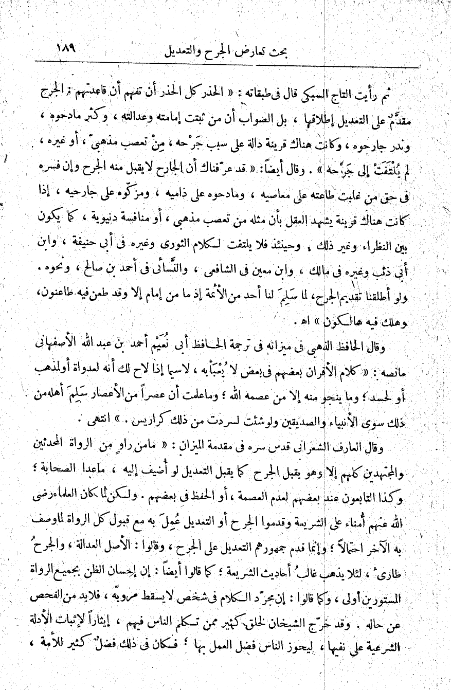 ثم رأيت التاج السبكي قال في طبقاته: "الحذر كل الحذر أن تفهم أن قاعدتهم: الجرح مقدم على التعديل إطلاقها، بل الصواب أن من ثبتت إمامته وعدالته، وكثر مادحوه، وندر جارحوه، وكانت هناك قرينة دالة على سبب جرحه من تعصب مذهبي أو غيره لم يلتفت إلى جرحه". وقال أيضًا: "قد عرفناك أن الجارح لا يقبل منه الجرح، وإن فسره في حق من غلبت طاعته على معاصيه ومادحوه على ذاميه ومزكوه على جارحيه إذا كانت هناك قرينة يشهد العقل بأن مثله من تعصب مذهبي أو منافسة دنيوية كما يكون بين النظراء وغير ذلك، وحينئذ فلا يلتفت لكلام الثوري وغيره في أبي حنيفة وابن أبي ذئب وغيره في مالك وابن معين في الشافعي، والنسائي في أحمد بن صالح ونحوه، ولو أطلقنا تقديم الجرح لما سلم لنا أحد من الأئمة إذ ما من إمام إلا وقد طعن فيه طاعنون وهلك فيه هالكون". ا. هـ.