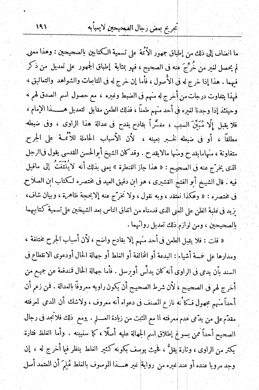 "قلت: فلا يقبل الطعن في أحد منهم إلا بقادح واضح لأن أسباب الجرح مختلفة، ومدارها على خمسة أشياء: البدعة أو المخالفة أو الغلط أو جهالة الحال أو دعوى الانقطاع في السند بأن يدعى في الراوي أنه كان يدلس أو يرسل: فأما جهالة الحال فمندفعة عن جميع من أخرج لهم في الصحيح لأن شرط الصحيح أن يكون راويه معروفًا بالعدالة فمن زعم أن أحدًا منهم مجهول فكأنه نازع المصنف في دعواه أنه معروف ولا شك أن المدعي لمعرفته مقدم على من يدعي عدم معرفته لما مع المثبت من زيادة العلم، ومع ذلك فلا تجد في رجال الصحيح أحدًا ممن يسوغ إطلاق اسم الجهالة عليه أصلًا كما سنبينه، وأما الغلظ فتارة يكثر من الراوي، وتارة يقل فحيث يوصف بكونه كثير الغلط ينظر فيما أخرج له إن وحد مرويا عنده أو عند غيره من رواية غير هذا الموصوف بالغلط علم أن المعتمد أصل