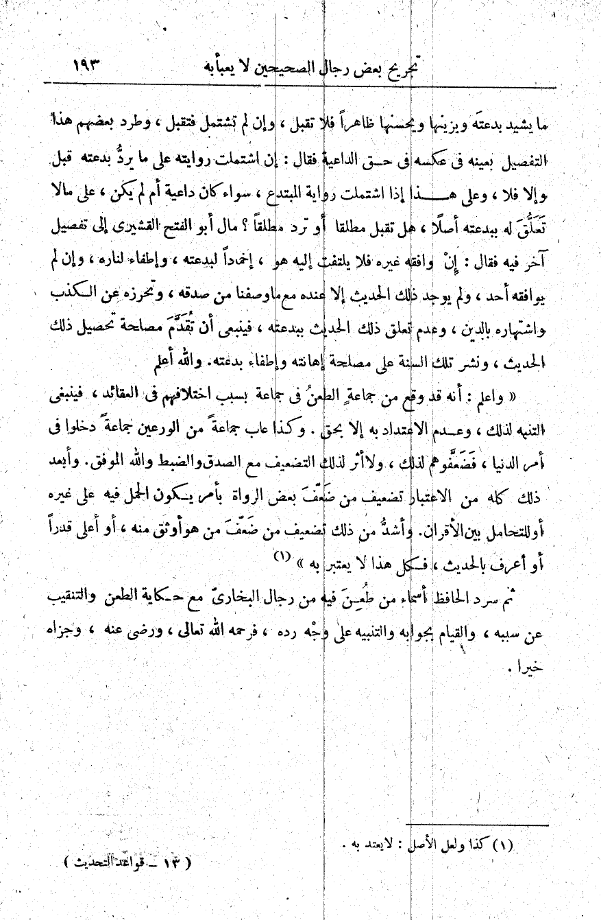 "واعلم: أنه قد وقع من جماعة الطعن في جماعة بسبب اختلافهم في العقائد، فينبغي التنبيه لذلك وعدم الاعتداد به إلا بحق، وكذا عاب جماعة من الورعين جماعة دخلوا في أمر الدنيا فضعفوهم لذلك، ولا أثر لذلك التضعيف مع الصدق والضبط والله الموفق، وأبعد ذلك كله من الاعتبار تضعيف من ضعف بعض الرواة بأمر يكون الحمل فيه على غيره أو للتحامل بين الأقران، وأشد من ذلك تضعيف من ضعف من هو أوثق منه أو أعلى قدرًا أو أعرف بالحديث فكل هذا لا يعتبر به"1.