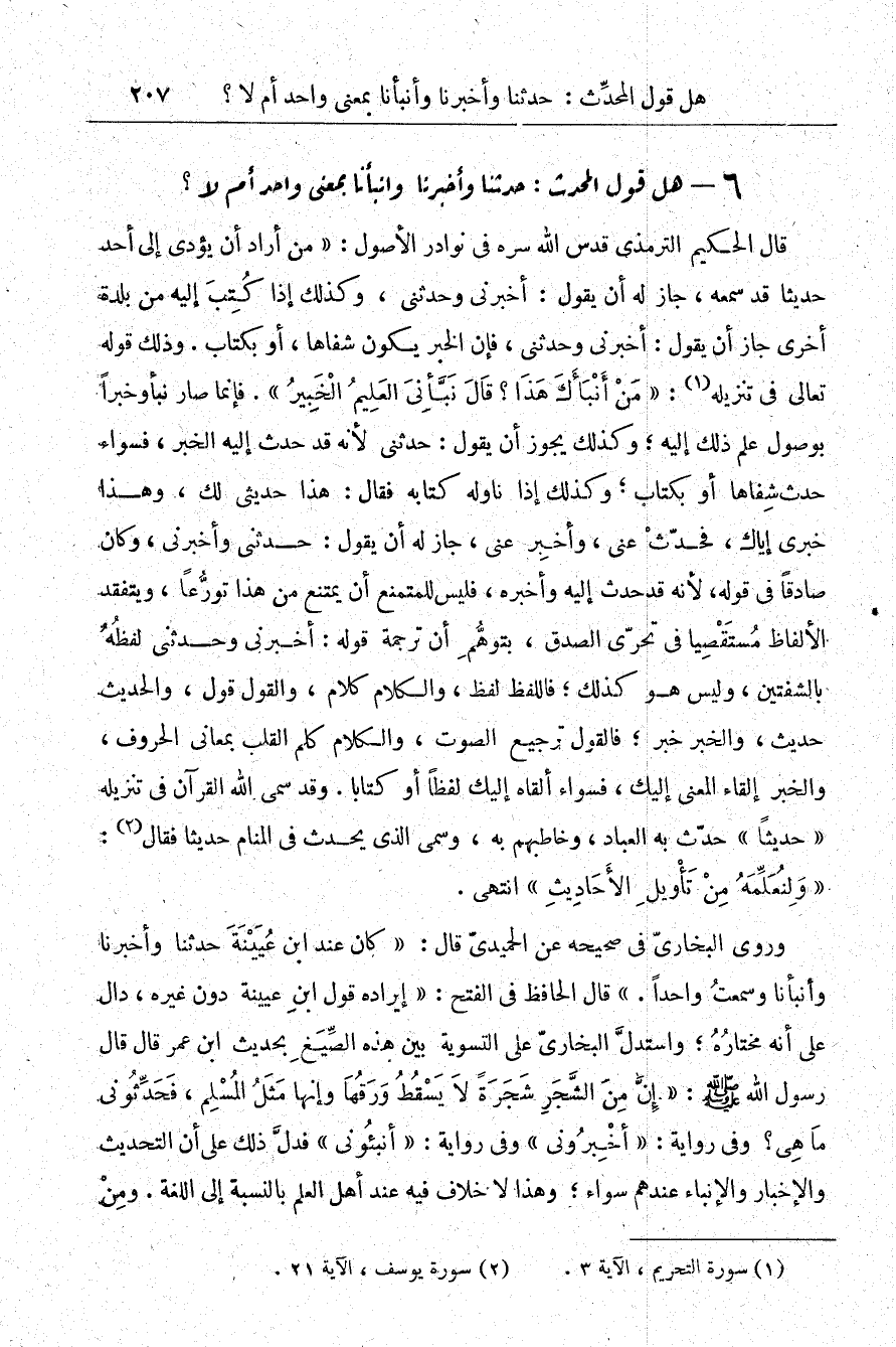 قال الحكيم الترمذي قدس الله سره في نوادر الأصول: "من أراد أن يؤدي إلى أحد حديثًا قد سمعه، جاز له أن يقول أخبرني وحدثني، وكذلك إذا كتب إليه من بلدة أخرى جاز أن يقول أخبرني، وحدثني فإن الخبر يكون شفاها أو بكتاب وذلك قوله تعالى في تنزيله1: {مَنْ أَنْبَأَكَ هَذَا قَالَ نَبَّأَنِيَ الْعَلِيمُ الْخَبِير} فإنما صار نبأ وخبرًا بوصول علم ذلك إليه، وكذلك يجوز أن يقول حدثني لأنه قد حدث إليه الخبر فسواء حدث شفاها أو بكتاب، وكذلك إذا ناوله كتابه فقال هذا حديثي لك، وهذا خبرني إياك فحدث عني، وأخبر عني جاز له أن يقول حدثني وأخبرني وكان صادقًا في قوله لأنه قد حدث إليه وأخبره فليس للمتمنع أن يمتنع من هذا تورعًا، ويتفقد الألفاظ مستقصيا في تحري الصدق بتوهم أن ترجمة قوله أخبرني وحدثني لفظه وبالشفتين، وليس هو كذلك فاللفظ لفظ والكلام كلام والقول قول والحديث حديث والخبر خبر، فالقول ترجيع الصوت، والكلام كلم القلب بمعاني الحروف، والخبر إلقاء المعنى إليك فسواء ألقاه إليك لفظًا أو كتابًا، وقد سمي الله القرآن في تنزيله: "حديثًا". حدث به العباد وخاطبهم به، وسمى الذي يحدث في المنام حديثًا فقال2: {وَلِنُعَلِّمَهُ مِنْ تَأْوِيلِ الْأَحَادِيثِ} . ا. هـ.