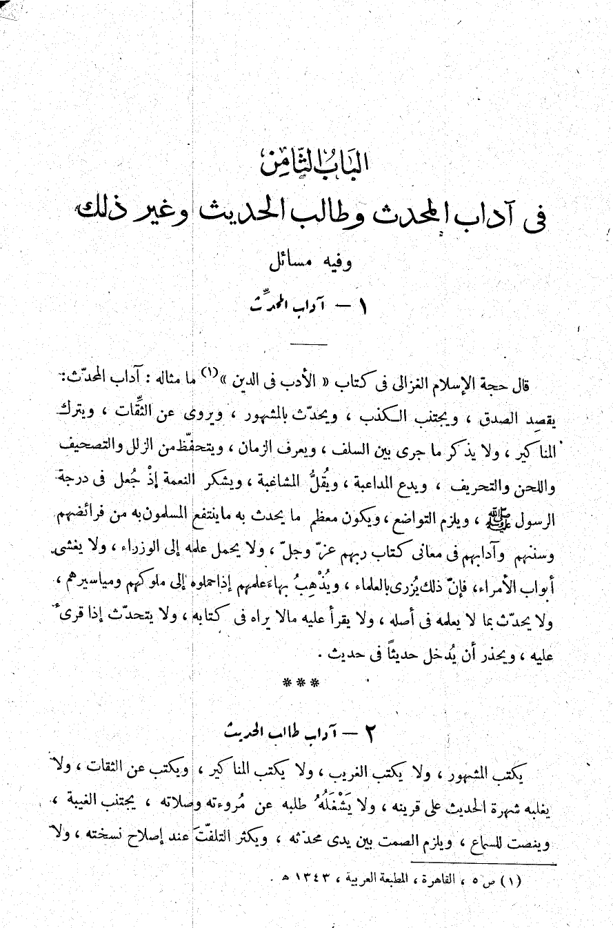 الباب الثامن: في آداب المحدث وطالب الحديث وغير ذلك؛ وفيه مسائل