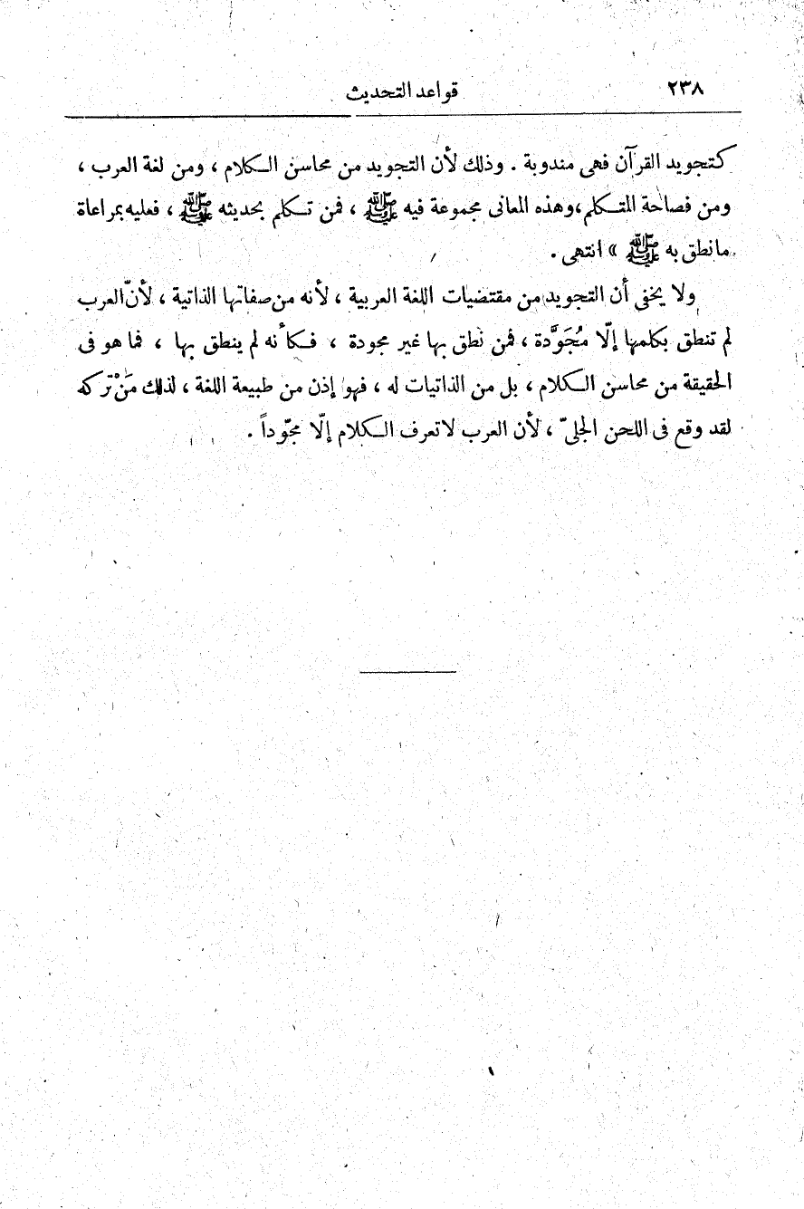 ولا يخفى أن التجويد من مقتضيات اللغة العربية؛ لأنه من صفاتها الذاتية؛ لأن العرب لم تنطق بكلمها إلا مجودة فمن نطق بها غير مجودة، فكأنه لم ينطق بها فما هو في الحقيقة من محاسن الكلام بل من الذاتيات له فهو إذن من طبيعة اللغة لذلك من تركه لقد وقع في اللحن الجلي لأن العرب لا تعرف الكلام إلا مجودًا.