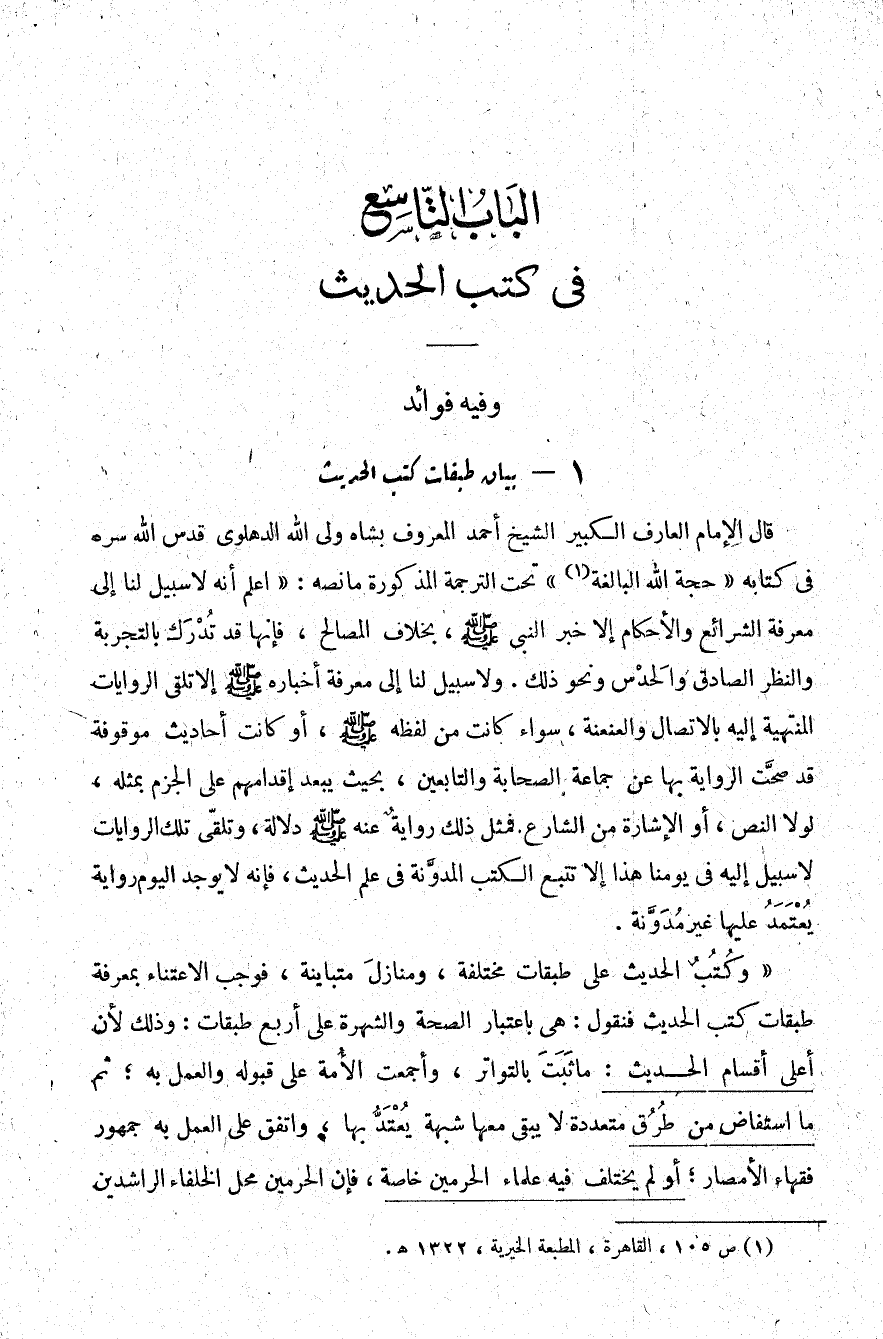 قال الإمام العارف الكبير الشيخ أحمد المعروف بشاه ولي الله الدهلوي قدس الله سره في كتابه: "حجة الله البالغة"1 تحت الترجمة المذكورة ما نصه: "اعلم أنه لا سبيل لنا إلى معرفة الشرائع والأحكام إلا خبر النبي -صلى الله عليه وسلم- بخلاف المصالح فإنها قد تدرك بالتجربة والنظر الصادق والحدس ونحو ذلك، ولا سبيل لنا إلى معرفة أخباره إلا تلقي الروايات المنتهية إلية بالاتصال والعنعنة سواء كانت من لفظه أو كانت أحاديث موقوفة قد صحت الرواية بها عن جماعة الصحابة والتابعين بحيث يبعد إقدامهم على الجزم بمثله لو النص أو الإشارة من الشارع فمثل ذلك رواية عنه دلالة، وتلقي تلك الروايات لا سبيل إليه في يومنا هذا إلا تتبع الكتب المدونة في علم الحديث، فإنه لا يوجد اليوم رواية يعتمد عليها غير مدونة.