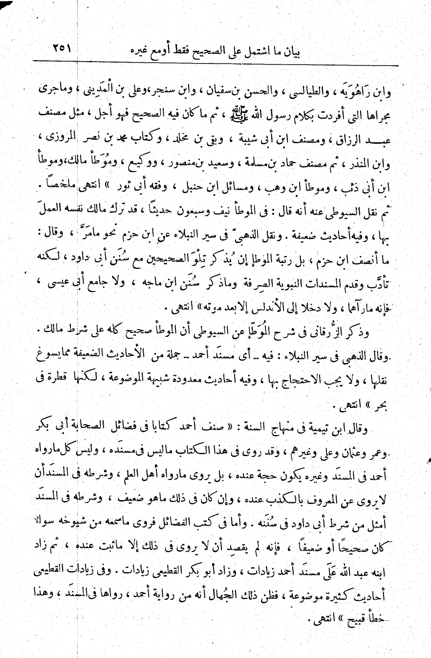 وابن راهويه، والطيالسي، والحسن بن سفين، وابن سنجر، وعلي بن المديني، وما جرى مجراها التي أفردت بكلام رسول الله -صلى الله عليه وسلم- ثم ما كان فيه الصحيح فهو أجل، مثل مصنف عبد الرزاق، ومصنف ابن أبي شيبة، وبقي بن مخلد، وكتاب محمد بن نصر المروزي، وابن المنذر، ثم مصنف حماد بن مسلمة، وسعيد بن منصور، ووكيع وموطأ مالك، وموطأ ابن أبي ذئب، وموطأ ابن وهب، ومسائل ابن حنبل، وفقه أبي ثور. انتهى ملخصًا.