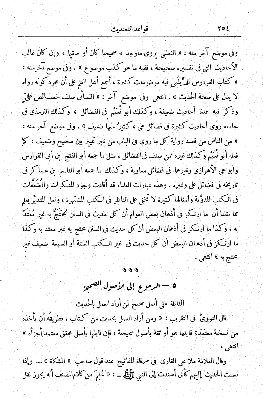 وفي موضع آخر منه: "الثعلبي يروي ما وجد، صحيحا كان أو سقيما، وإن كان غالب الأحاديث التي في تفسيره صحيحة، ففيه ما هو كذب موضوع". وفي موضع آخر منه: "كتاب الفردوس للديلمي فيه موضوعات كثيرة، أجمع أهل العلم على أن مجرد كونه رواه لا يدل على صحة الحديث". ا. هـ. وفي موضع آخر: "النسائي صنف خصائص علي، وذكر فيه عدة أحاديث كثيرة في فضائل علي كثير منها ضعيف"، وفي موضع آخر منه: "من الناس من قصد رواية كل ما روي في الباب من غير تمييز بين صحيح وضعيف كما فعله أبو نعيم وكذلك غيره ممن صنف في الفضائل مثل ما جمعه أبو الفتح بن أبي الفوارس وأبو علي الأهوازي وغيرهما في فضائل معاوية، وكذلك ما جمعه أبو القاسم بن عساكر في تاريخه في فضائل علي وغيره، وهذه عبارات العلماء قد أفادت وجود المنكرات والمضعفات في الكتب المدونة وأمثالها كثيرة لا تخفى على الناظر في الكتب المشتهرة، ولعل المتدبر يعلم مما نقلنا أن ما ارتكز في أذهان بعض العوام أن كل حديث في السنن محتج به غير معتد به وكذا ما ارتكز في أذهان البعض أن كل حديث في السنن محتج به غير معتد به. وكذا ما ارتكز في أذهان البعض أن كل حديث في غير الكتب الستة أو السبعة ضعيف غير محتج به". ا. هـ.