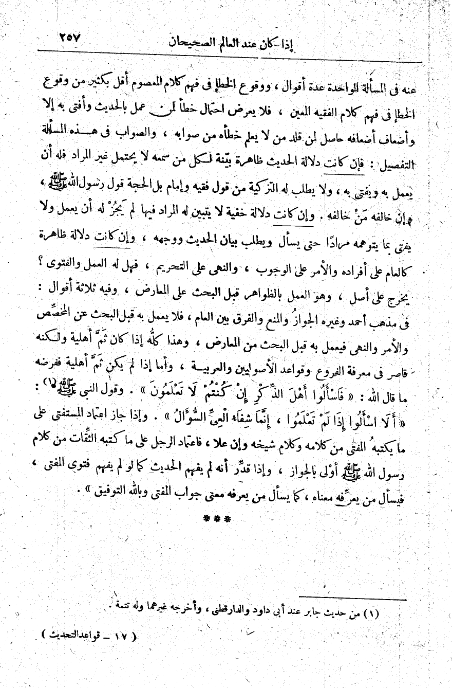 عنه في المسألة الواحدة عدة أقوال، ووقوع الخطأ في فهم كلام المعصوم أقل بكثير من وقوع الخطأ في فهم كلام الفقيه المعين، فلا يعرض احتمال خطأ لمن عمل بالحديث وأفتى به إلا وأضعاف أضعافه حاصل لمن قلد من لا يعلم خطأه من صوابه، والصواب في هذه المسألة التفصيل: فإن كانت دلالة الحديث ظاهرة بينة لكل من سمعه لا يحتمل غير المراد فله أن يعمل به ويفتي به ولا يطلب له التزكية من قول فقيه وإمام، بل الحجة قول رسول الله -صلى الله عليه وسلم- وإن خالفه من خالفه، وإن كانت دلالة خفية لا يتبين له المراد فيها لم يجز له أن يعمل ولا يفتي بما يتوهمه مرادًا، حتى يسأل ويطلب بيان الحديث ووجهه وإن كانت دلالة ظاهرة كالعام على أفراده، والأمر على الوجوب، والنهي على التحريم فهل له العمل والفتوى يخرج على أصل وهو العمل بالظواهر قبل البحث على المعارض، وفيه ثلاثة أقوال في مذهب أحمد وغيره الجواز والمنع والفرق بين العام، فلا يعمل به قبل البحث عن المخصص والأمر والنهي فيعمل به قبل البحث من المعارض، وهذا كله إذا كان ثَمَّ أهلية، ولكنه قاصر في معرفة الفروع وقواعد الأصوليين والعربية، وأما إذا لم يكن ثم أهلية ففرضه ما قال الله: {فَاسْأَلوا أَهْلَ الذِّكْرِ إِنْ كُنْتُمْ لا تَعْلَمُونَ} وقول النبي -صلى الله عليه وسلم1: "ألا اسألوا إذا لم تعلموا، إنما شفاء العي السؤال". وإذا جاز اعتماد المستفتي على ما يكتبه المفتي من كلامه وكلام شيخه وإن علا، فاعتماد الرجل على ما كتبه الثقات من كلام رسول الله -صلى الله عليه وسلم- أولى بالجواز وإذا قدر أنه لم يفهم الحديث كما لو لم يفهم فتوى المفتي، فيسأل من يعرفه معناه كما يسأل من يعرفه معنى جواب المفتي وبالله التوفيق.