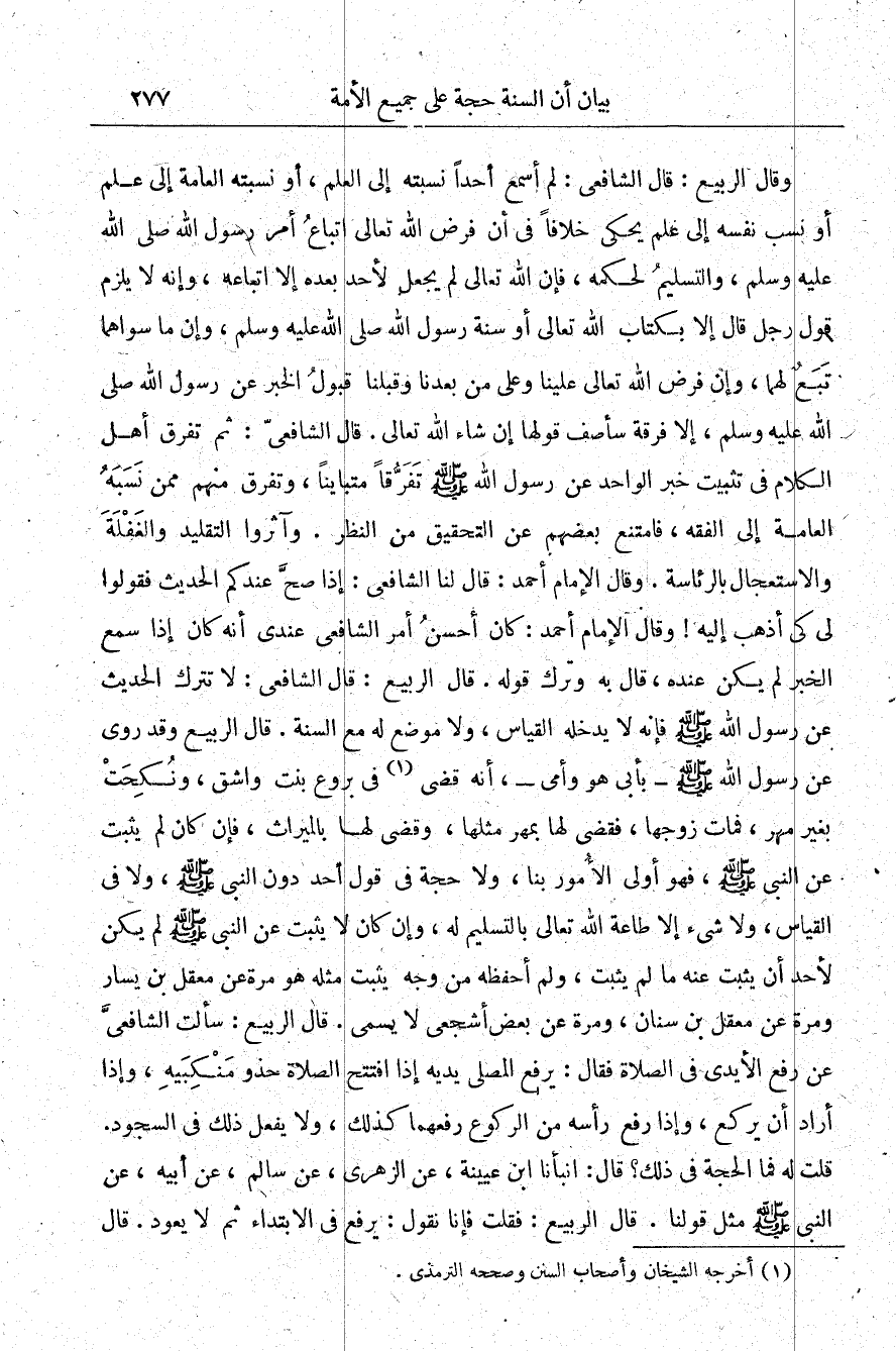 وقال الربيع: قال الشافعي: لم أسمع أحدًا نسبته إلى العلم أو نسبته العامة إلى علم أو نسب نفسه إلى علم يحكي خلافًا في أن فرض الله تعالى اتباع أمر رسول الله -صلى الله عليه وسلم- والتسليم لحكمه فإن الله تعالى لم يجعل لأحد بعده إلا اتباعه، وإنه لا يلزم قول رجل قال إلا بكتاب الله تعالى أو سنة رسول الله -صلى الله عليه وسلم- وإن ما سواهما تبع لهما، وإن فرض الله تعالى علينا وعلى من بعدنا وقبلنا قبول الخبر عن رسول الله -صلى الله عليه وسلم- إلا فرقة سأصف قولها إن شاء الله تعالى. قال الشافعي: ثم تفرق أهل الكلام في تثبيت خبر الواحد عن رسول الله -صلى الله عليه وسلم- تفرقا متباينًا، وتفرق منهم ممن نسبه العامة إلى الفقه فامتنع بعضهم عن التحقيق من النظر وآثروا التقليد والغفلة والاستعجال بالرئاسة، وقال الإمام أحمد: قال لنا الشافعي: إذا صح عندكم الحديث فقولوا لي كي أذهب إليه، وقال الإمام أحمد: كان أحسن أمر الشافعي عندي أنه كان إذا سمع الخبر لم يكن عنده قال به وترك قوله، قال الربيع: قال الشافعي: لا تترك الحديث عن رسول الله -صلى الله عليه وسلم- فإنه لا يدخله القياس ولا موضع له من السنة، قال الربيع: وقد روى عن رسول الله -صلى الله عليه وسلم- بأبي هو وأمي، أنه قضى1 في بروع بنت واشق ونُكحت بغير مهر فمات زوجها فقضى لها بمهر مثلها وقضى لها بالميراث، فإن كان لم يثبت عن النبي فهو أولى الأمور بنا، ولا حجة في قول أحد دون النبي -صلى الله عليه وسلم- ولا في القياس ولا شيء إلا طاعة الله تعالى بالتسليم له، وإن كان لا يثبت عن النبي -صلى الله عليه وسلم- لم يكن لأحد أن يثبت عنه ما لم يثبت ولم أحفظه من وجه يثبت مثله هو مرة عن معقل بن يسار ومرة عن معقل بن سنان ومرة عن بعض أشجعي لا يسمى، قال الربيع: سألت الشافعي عن رفع الأيدي في الصلاة فقال: يرفع المصلي يديه إذا افتتح الصلاة حذو منكبيه وإذا أراد أن يركع وإذا رفع رأسه من الركوع رفعهما كذلك ولا يفعل ذلك في السجود قلت له: فما الحجة في ذلك قال: أنبأنا ابن عيينة عن الزهري عن سالم عن أبيه عن النبي -صلى الله عليه وسلم- مثل قولنا قال الربيع: فقلت فإنا نقول يرفع في الابتداء ثم لا يعود قال