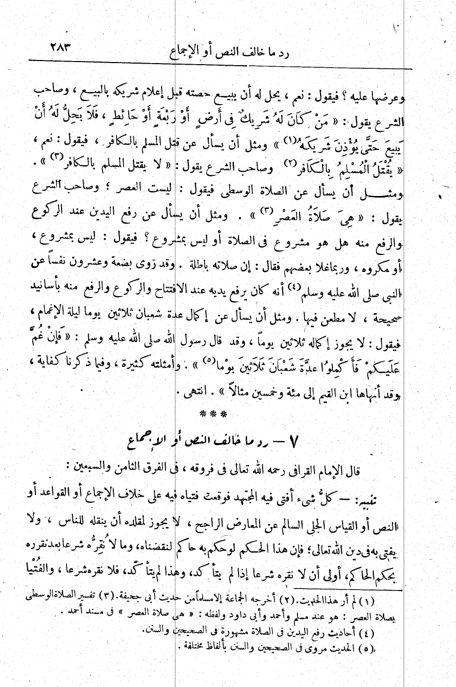 وعرضها عليه؟ فيقول: نعم يحل له أن يبيع حصته قبل إعلام شريكه بالبيع، وصاحب الشرع يقول: "من كان له شريك في أرض أو ربعة أو حائط فلا يحل له أن يبيع حتى يؤذن شريكه"1، ومثل أن يسأل عن قتل المسلم بالكافر فيقول نعم: "يقتل المسلم بالكافر، وصاحب الشرع يقول: "لا يقتل المسلم بالكافر" 2، ومثل أن يسأل عن الصلاة الوسطى فيقول ليست العصر، وصاحب الشرع يقول: "هي صلاة العصر"3 ومثل أن يسأل عن رفع اليدين عند الركوع، والرفع منه هل مشروع في الصلاة أو ليس بمشروع فيقول ليس بمشروع أو مكروه، وربما غلا بعضهم فقال: إن صلاته باطلة، وقد روى بضعه وعشرون نفسًا عن النبي -صلى الله عليه وسلم-4 أنه كان يرفع يديه عند الافتتاح والركوع والرفع منه بأسانيد صحيحة لا مطعن فيها، ومثل أن يسأل عن إكمال عدة شعبان ثلاثين يوما ليلة الإغمام فيقول: لا يجوز إكماله ثلاثين يومًا، وقد قال رسول الله -صلى الله عليه وسلم: "فإن غم عليكم فأكملوا عدة شعبان ثلاثين يوما" 5 وأمثلته كثيرة، وفيما ذكرنا كفاية وقد أنهاها ابن القيم إلى مائة وخسمين مثالًا". ا. هـ.